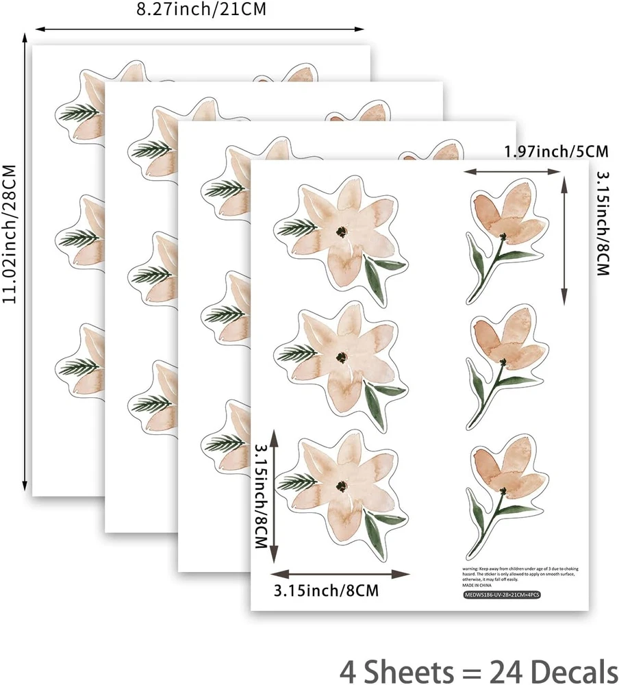 Value Package: 4 Sheets watercolor boho nursery wall stickers, each measures 21 cm*28 cm (8.27 inch * 11.02 inch) wall stickers in total. Diverse Styles: Watercolor boho features is very suitable for expressing animal and plant themes. Infants and young children are attracted by natural elements that are full of fun and vibrant colors.Daisy, mushroom, duck, sea animals and ducks are common poultry and livestock that are very close to daily life. Reliable Materials: Transparent PVC material, waterproof, high saturation, comes with adhesive backing, easy to peel off and clean. Simple steps to install the wall decal onto door, painted wall or any smooth, flat, dry and dust free surface. Installation Method: Make sure that the surface to be pasted is smooth, without floating dust and oil stains. Make a simple plan according to the pasting order, you can also DIY according to your own creativity. Gently peel the sticker from the bottom paper and paste directly, first paste the middle and then spread it to the sides. Wide Application: It can be used in office, kitchen, nursery, bedroom, living room, home, Hotel, Coffee shop, shopping mall and can be stuck to windows, mirrors, cars, electrical appliances and etc. Product Description Boho Nursery Wall Stickers Design story Boho style can create an eclectic vibe and make Baby's room feel super cozy and honey. How to describe boho style? It is the current trend, it's vintage, eclectic and entirely personal. We chose classic Boho Nursery elements such as geometry (semi-circles, lines), flora and fauna,etc. andpaired them with a neutral color (suitable for both boy's and girl's rooms) on white or neutral walls, which will be awonderful combination. Product Details Renderings Simple patterns, small flowers, fish, girls, ducks, all apply simple and elegant soft colors, very suitable for baby rooms, kindergartens and other families with babies, so that children can feel more love from this world. Packaging method 11.02*8.27 inch/28*22 cm 4 Sheets The total number of decals varies for different products, but they are all 6 sheets Actual captured images Suitable for any color of walls High coverage Peel & Stick Reliable Materials Simple steps to install the PVC wall decal onto door, painted wall or any smooth, flat, dry and dust free surface.It's easy to peel and stick. Translucent material, which can be visited on both sides. Installation Method Make sure that the surface to be pasted is smooth, without floating dust and oil stains. Make a simple plan according to the pasting order, you can also DIY according to your own creativity. Gently peel the sticker from the bottom paper and paste directly, first paste the middle and then spread it to the sides. Diverse Styles Gentle warm color matching, bohemian pattern design, with falling leaves, flowers, rainbow, sun and other patterns, very suitable for a little girl's bedroom or kindergarten, but also can be used to dress up home cabinets. Wide Application Nursery Bedroom Bathroom Kids room Kitchen Living room Windows Electrical appliances and etc.
