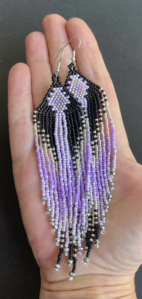 1 pair of long western style graduated black, purple and silver seed bead beaded earrings. You will receive earrings pictured. The earrings are made with seed beads. The earrings are approximately 5 1/2" long with the ear hooks included. They are for pierced ears. 0-ea-seed-250-1