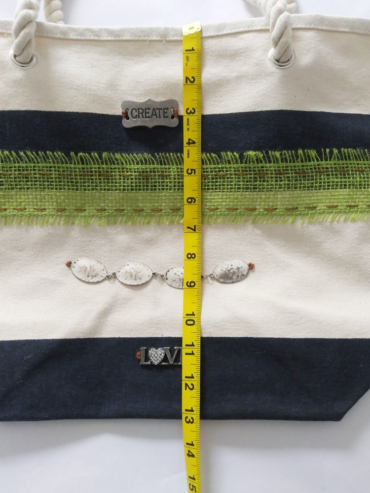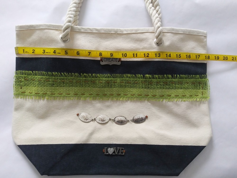 Bag Width: 18 in Features: Eco Friendly Shape: Trapezoid Modification Description: New Canvas bag hand sewn embellishments Modified Item: Yes UPC: Does not apply Hardware Material: Metal Exterior Color: Multi Accents: Stitching gtin13: Does not apply Handle/Strap Color: Off White Handle Style: Double Handles Exterior Material: Canvas Bag Height: 13 in Size: Large Closure: Open Style: Hobo Bag Brand: Handmade Pattern: Colorblock Theme: Boho Fabric Type: Canvas Department: Women