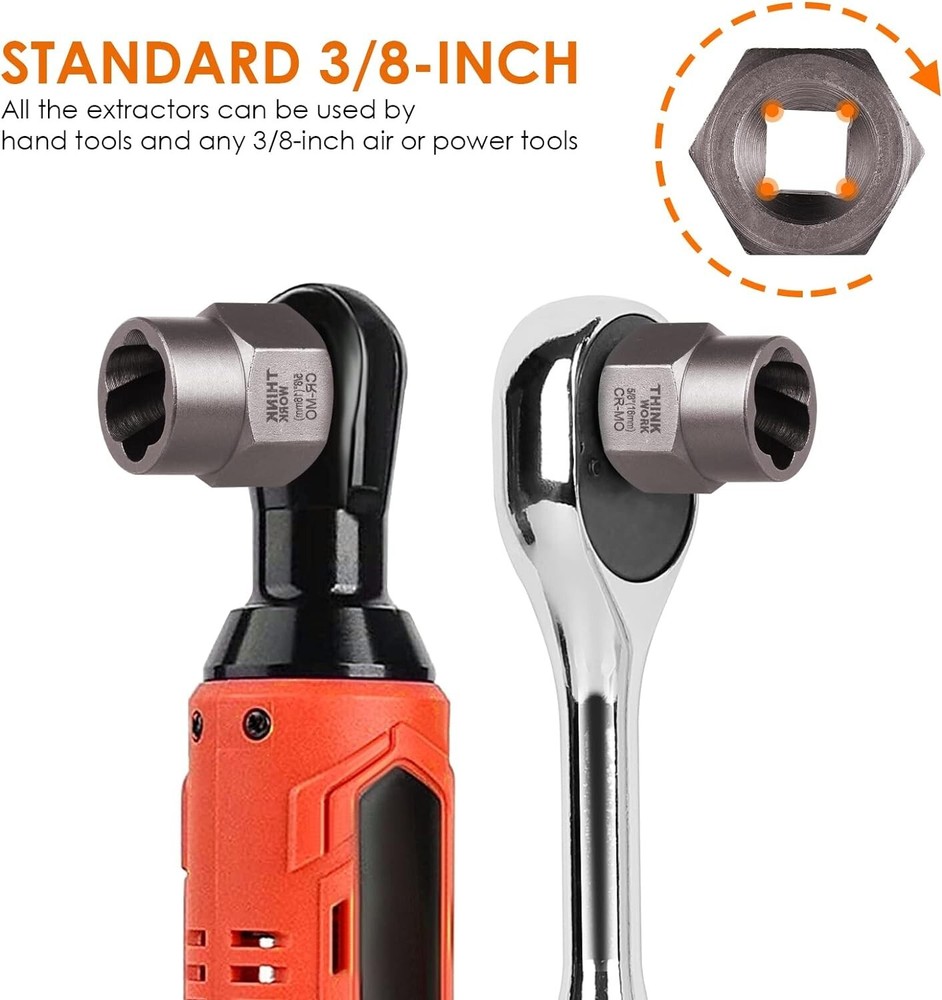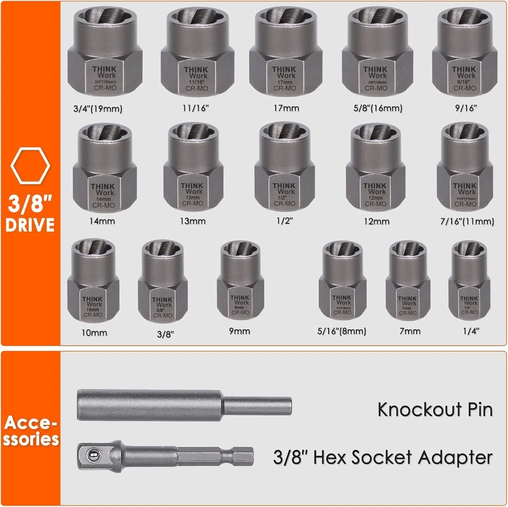 Bolt Extractor Kit, 18 Pieces Bolt Extractor Set, Stripped Bolt Extractor for Removing Damaged, Frozen, Rusted, Rounded-Off Bolts, Nuts & Screws Each bolt extractor is made of high hardness chrome-molybdenum steel for superior durability and longer life. It will easily extract damaged bolts, nuts, and screws even if they are stripped, rusted, or frozen. The internal thread with reverse spiral flutes design to bite down to provide maximum gripping power, the more you turn, the tighter the socket grips. Standard 3/8-inch drive and hex adapter to let the extractors compatible with common to heavy-duty power tools, drivers and screwdrivers handle tools. The knockout pin for easier removal. 18 pieces 3/8 inch drive bolt & nut remover comes with 3/4"(19mm), 11/16", 17mm, 5/8"(16mm), 9/16", 14mm, 13mm, 1/2", 12mm, 7/16"(11mm), 10mm, 3/8", 9mm, 5/16"(8mm), 7mm, 1/4", hex adapter and knockout pin. Heavy-duty blow-molded case lets all the extraction sockets stay organized and take your set on the go. 5 Pcs Lug Nut Remover 6 Pcs Lug Nut Remover 10 Pcs Lug Nut Remover 13 Pcs Lug Nut Remover 24 Pcs Damaged Screw Extractor Set Add to Cart Add to Cart Add to Cart Add to Cart Add to Cart Customer Reviews out of 5 stars 2,616 out of 5 stars 2,616 out of 5 stars 2,616 out of 5 stars 2,616 out of 5 stars 249 Price $$ $$ $$ $$ $$ Material Cr-M Cr-M Cr-M Cr-M HSS 6542 Drive Size 1/2" 1/2" 1/2" 1/2" / Storage Case ✓ ✓ ✓ ✓ ✓