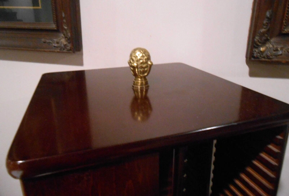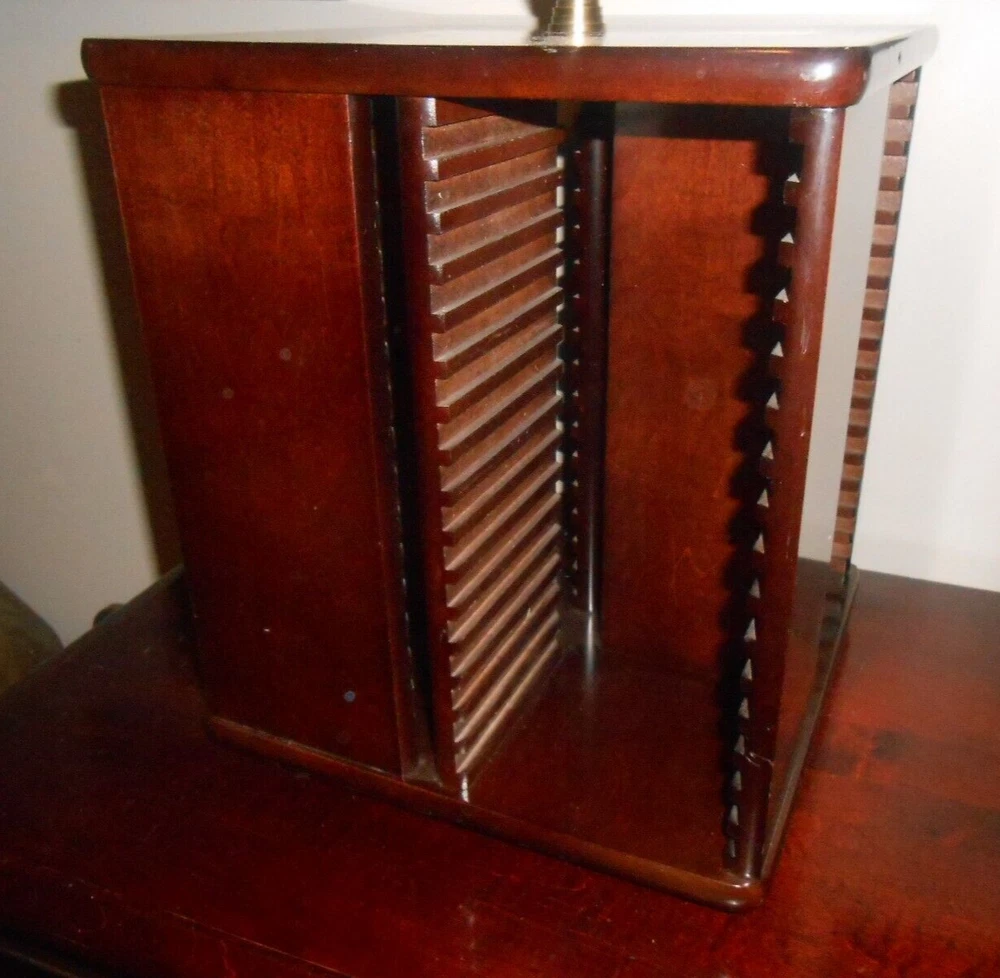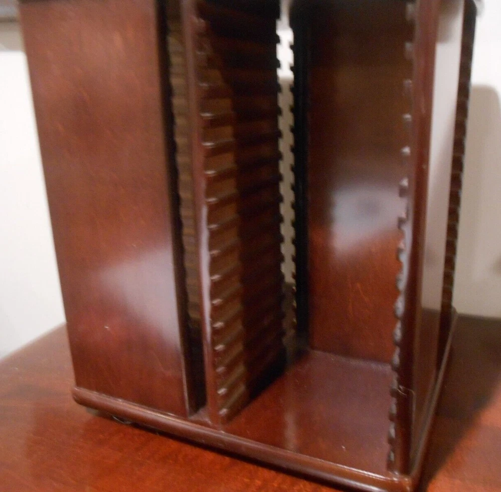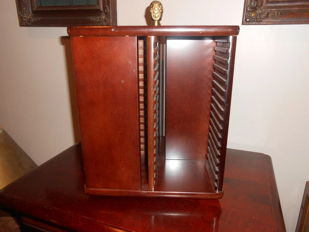 64 CD, Game Holder Wood Spinning Carousel ~ Tower Rack Storage ~ by The Bombay Company. Very good Used Condition... close inspection shows a few minor blemishes, scratches, spots, or signs of use. Cherry Wood Finish With a Brass Finial On Top. Very Nice.
