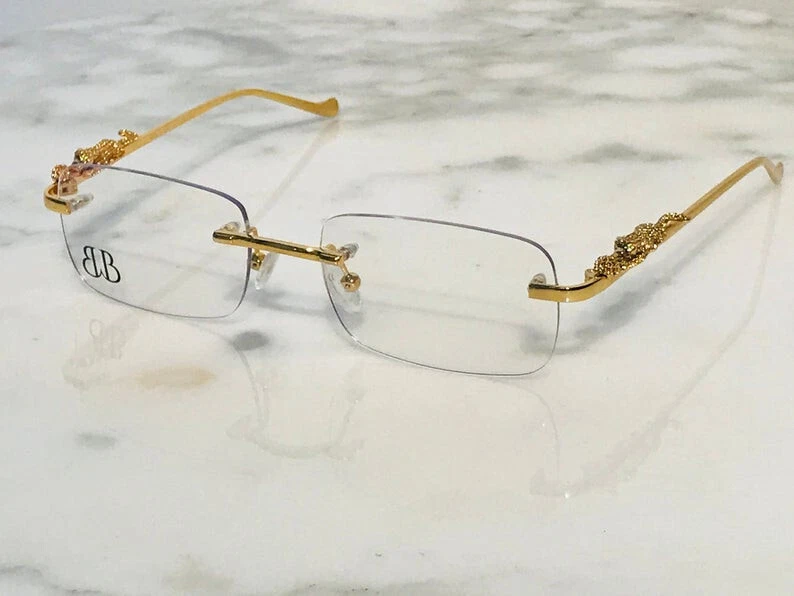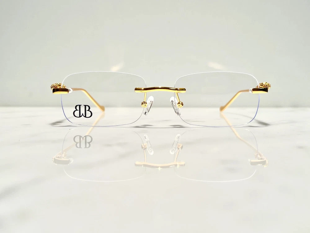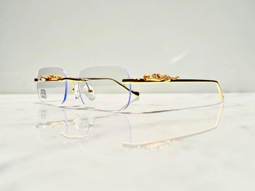 Brand: Bonano Model: Giaguaro Size: 54-18-140 Color: Gold :Handmade stainless steel construction plated in 18k gold :Handmade Jaguar adorns both left & right temple :18k gold plated metal frame inlay, temple and segments :Bonano Signature logo inlay inner right temple : Bonano CR-39 Non Prescription Clear Demo Lenses. :Comes with Bonano storage box, cleaning cloth, hard-case & frames + lenses :Frame Size 54-18-140 SHARE SHARE ON FACEBOOK TWEET TWEET ON TWITTER PIN IT PIN ON PINTEREST