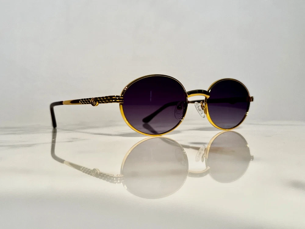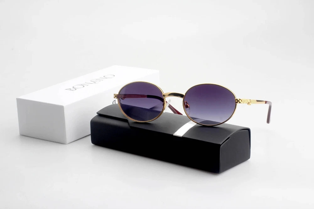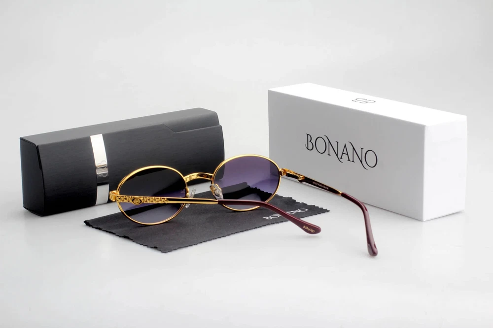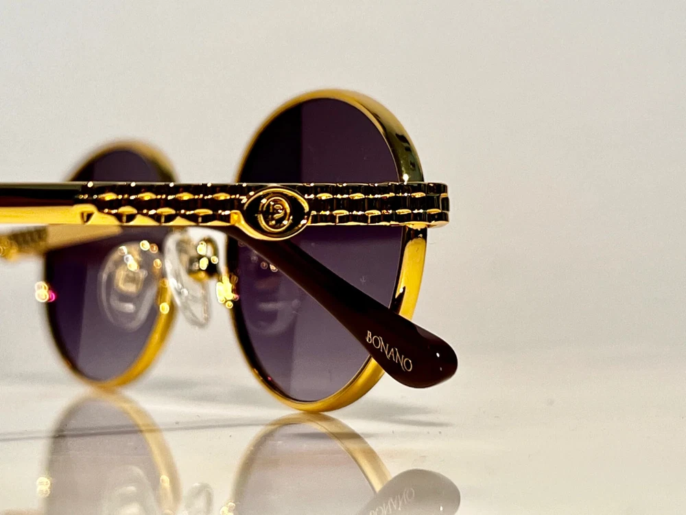 Brand- Bonano Model- Portofino Size: 51-22-140 Color: Gold :Handmade stainless steel construction plated in 18k gold :Jubilee pattern adorns both left & right temple :18k gold plated metal frame inlay, temple and segments :Bonano Signature logo inlay inner right temple :Bonano smoked grey (black) lenses. :Comes with Bonano storage box, cleaning cloth, hard-case & frames + lenses :Frame Size 51-22-140 SHARE SHARE ON FACEBOOK TWEET TWEET ON TWITTER PIN IT PIN ON PINTEREST SHARE SHARE ON FACEBOOK TWEET TWEET ON TWITTER PIN IT PIN ON PINTEREST