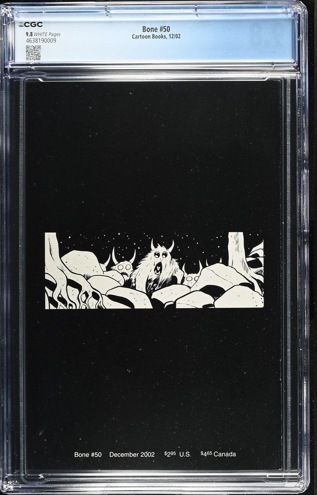 Welcome comic book community to the Destroyer of Worlds Comics store and our listing for Bone 50 CGC 9.8 We are a small shop and our focus is to bring the best buying experience to our customers. Destroyer of Worlds Comics is an authorized CGC Dealer which grants us access to the CGC database for all graded book details which are included in every listing along with the hi resolution scans taken by CGC. We know that buying comics online can be stressful so we proactively eliminate the most common sources of stress by packing our comics professionally using BCW Graded Comic Bags and then placing them into sturdy 200 lb test boxes to withstand any mishandling while in transit with the carrier. When we receive an order it becomes top priority and your order is immediately pulled from inventory and packaged properly to arrive in your hands as quickly as possible. Our goal is for you to not worry about your order arriving late or guessing when it will be shipped. When you buy from our store you will also receive hassle free 30 day returns and we will cover the shipping cost back to us if you decide to make a return. We hope our commitment to protecting comics and servicing our customers provides a trustworthy and pleasant experience and thank you for considering us. The images in the listing are the actual item you will receive after purchasing. If you have any questions prior to making a decision please reach out and we will answer promptly. We are located in southern Florida not far from CGC and add new listings regularly so please take a look at our other listings if you are looking for CGC graded books and favorite us as a seller if you enjoyed buying from us. CGC Certification Info Title: Bone Issue: 50 Grading Company: CGC Grade: 9.8 CGC Cert #: 4638190009 Page Quality: WHITE Issue Date: 12/02 Issue Year: 2002 Publisher: Cartoon Books Grade Category: Modern Total Graded By CGC: In 9.8: 5 Grader Notes: None CGC Census Report CGC Database Query Time: 2025-10-24 13:02:20 Mint 10.0: 0 Mint 9.9: 0 Near Mint/Mint 9.8: 5 Near Mint+ 9.6: 13 Near Mint 9.4: 5 Near Mint- 9.2: 4 Very Fine/Near Mint 9.0: 2 Very Fine+ 8.5: 0 Very Fine 8.0: 0 Very Fine- 7.5: 0 Fine/Very Fine 7.0: 0 Fine+ 6.5: 0 Fine 6.0: 0 Fine- 5.5: 0 Very Good/Fine 5.0: 0 Very Good+ 4.5: 0 Very Good 4.0: 0 Very Good- 3.5: 0 Good/Very Good 3.0: 0 Good+ 2.5: 0 Good 2.0: 0 Good- 1.8: 0 Fair/Good 1.5: 0 Fair 1.0: 0 Poor 0.5: 0 Case Condition We understand every collector has a unique set of standards when it comes to condition of the case and we often receive entire submissions with defects therefore we make every effort to note those conditions in the listing since they are often not visible in the scanned images. Nearly every case we receive from CGC has at least one of the following defects: grade on label not centered, label mounted crooked, newton rings, scuffing, scratches, case stress from the sealing process or inner well movement. To keep you informed before making a purchase decision we note major defects like cracks, newton rings, heavy scratches, and major scuffing in the listing but do not list the minor ones. If there are any flaws you dislike in particular please message us and we would be happy to review any of our listings and get back with you with every flaw we can find on the case. In the event the case arrives and is not to your satisfaction please reach out and we will offer to replace it if we have one available in better condition or a return can be opened at no cost within 30 days to receive a full refund. Pricing All fixed price listings are firm. We price our books at fair value according to recently sold listings but do realize prices fluctuate frequently when auctions are involved so we sometimes create auction listings for a chance at reduced prices for those who enjoy the thrill of the hunt. We also regularly run promotional coupon codes for volume discounts on orders of multiple fixed price listings so be sure to add listings to your watchlist and check back frequently. Shipping Policy Destroyer of Worlds Comics typically ships your items same day or next business day after payment is made. CGC graded comics are wrapped both vertically and horizontally in 5/16 inch bubble wrap and then placed into a 200 lb test corrugated box for protection. Ungraded comics are shipped in Gemini Comic Mailers. Combined shipping is offered for both domestic and international buyers. Please note for international orders any additional import fees duties taxes or customs charges are the sole responsibility of the buyer. These charges are determined by your country's customs office and we unfortunately have no influence over the amount charged or the duration of the assessment process due to the customs forms being automated. Please be aware that customs procedures and policies vary from country to country. If you have any concerns or questions regarding import fees duties or taxes we recommend contacting your local customs office before making a purchase. Return Policy Free returns available on all CGC graded books within 30 days of purchase.