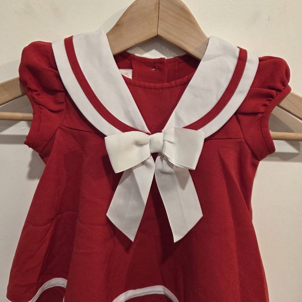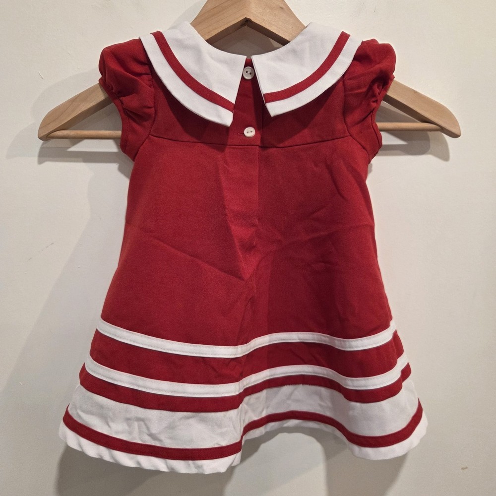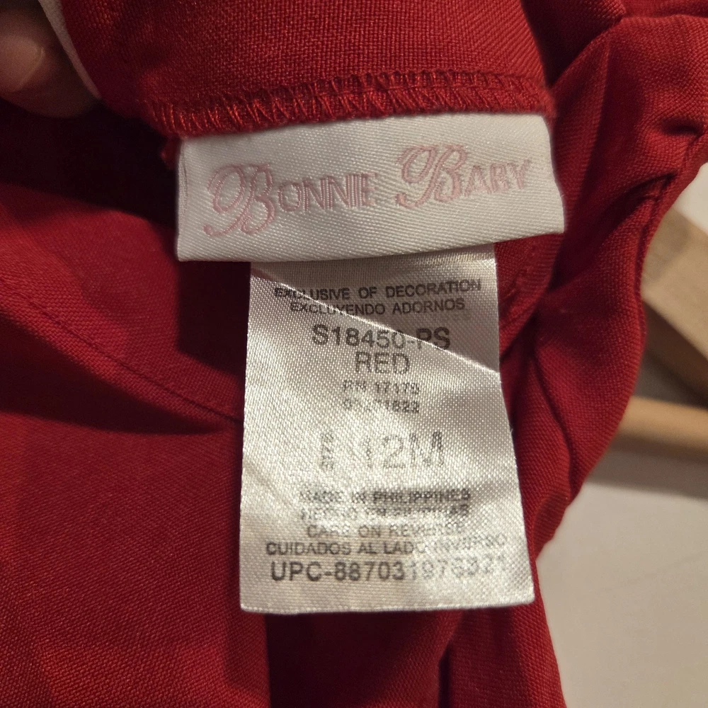 The Bonnie Baby Girls Red Sailor Dress in size 12 months is a charming and nautical-themed option for your little one. The sleeveless design with a Peter Pan neckline and button closure offers both style and comfort. The A-line silhouette and short dress length make it perfect for parties and formal occasions, while the red color adds a pop of vibrancy to any outfit. Perfect for summer and spring seasons, this dress is a timeless piece that will have your baby girl looking adorable and stylish. Length 15" Pit to pit 11" This is only the dress. I do not have the bloomers that go with it. *** please picture of seam and stitching showing through on white
