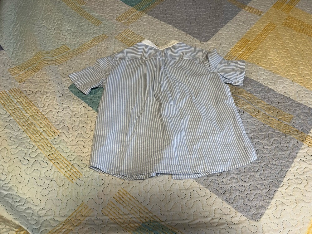 Measurements and conditions as shown in photos The Bonpoint Size 8 Striped Button Shirt in blue and white is a stylish and classic piece perfect for young boys. Made from cotton, this dress shirt features a collared neckline and button closure for a polished look. Ideal for special occasions or everyday wear, this shirt is designed with a timeless striped pattern that adds a touch of sophistication to any outfit.