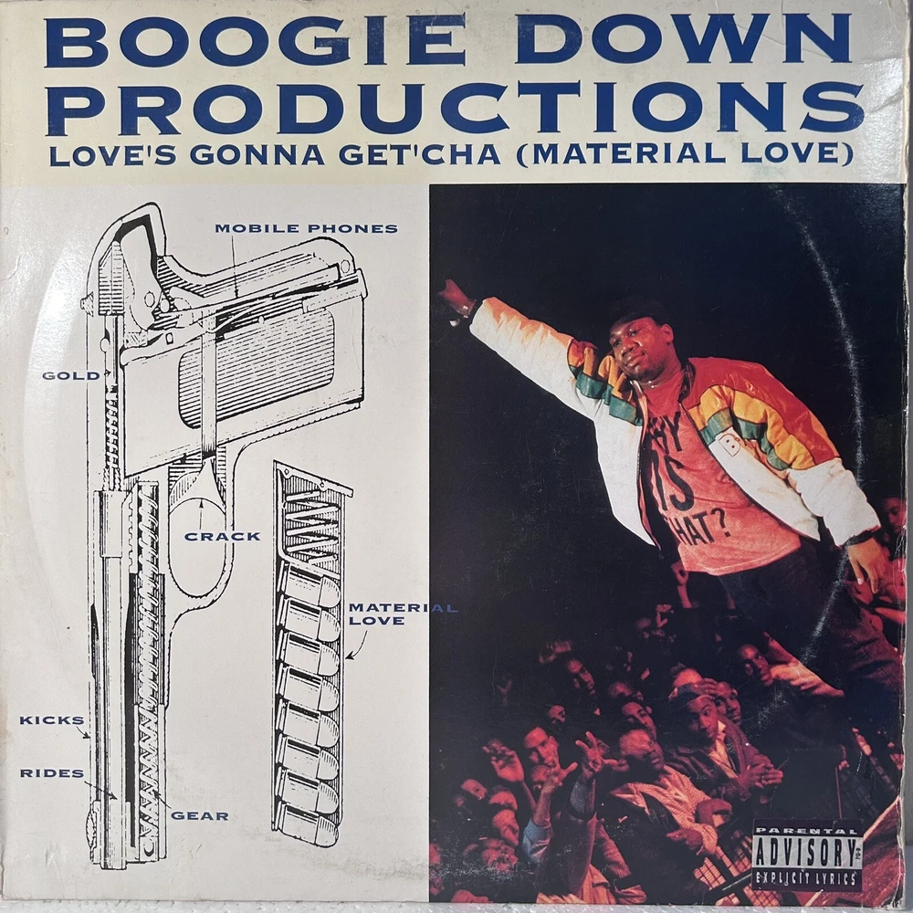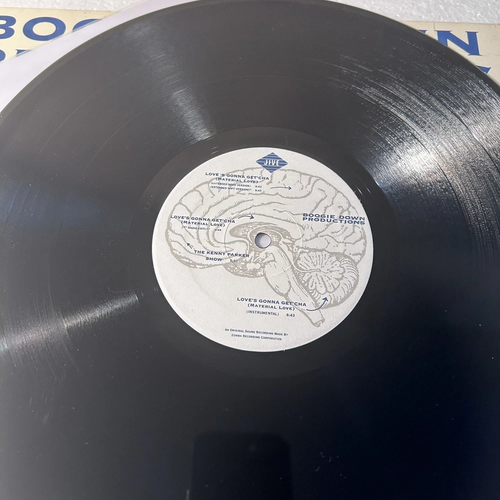 This Boogie Down Productions single on vinyl is a must-have for any hip-hop and soul fan. The record features the hit song "Love's Gonna Get'cha" and is in very good plus (VG+) grading. The sleeve is in very good (VG) grading with some ringwear and edgewear. The record is 12" in size and plays at 33 RPM. It was released in 1990 under the Jive record label. The black vinyl material adds to the overall aesthetic of the piece. This record is a great addition to any collection and is sure to impress.