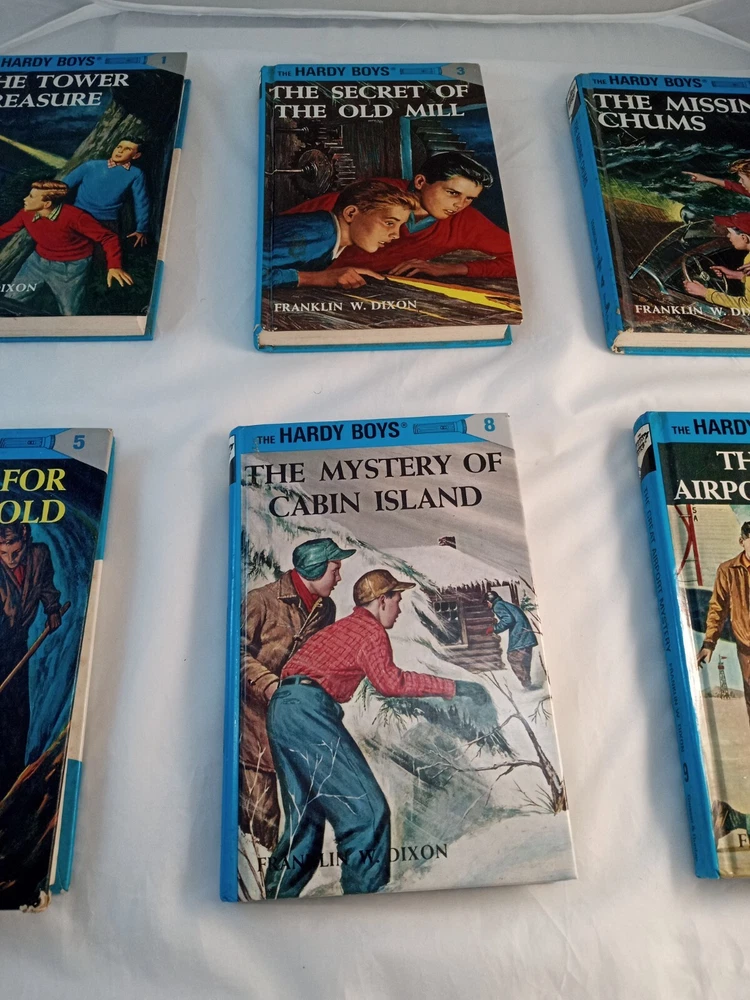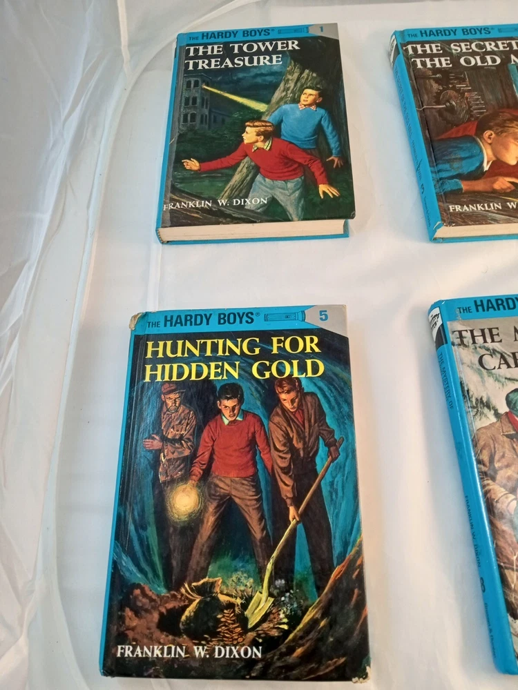 This lot consists of five vintage Hardy Boys books published by Grosset & Dunlap. The books are hardcover and written in English by Franklin W Dixon. They belong to the Antiquarian & Collectible category and are perfect for fans of the Hardy Boys character family. The books are in good condition and are a great addition to any book collection.