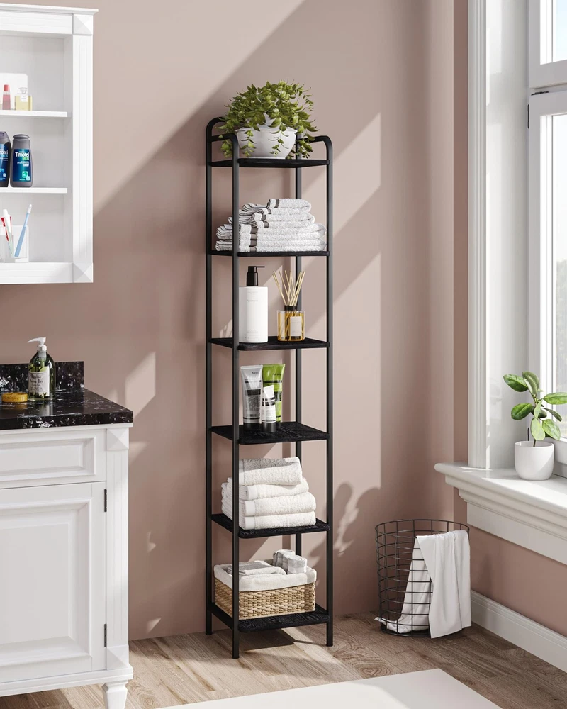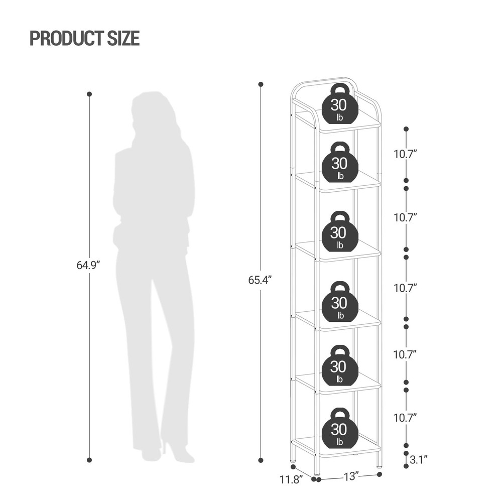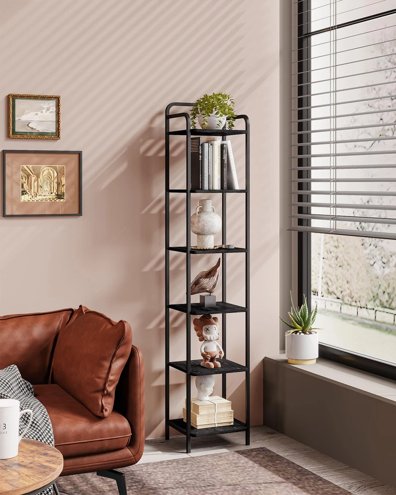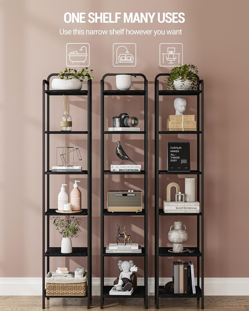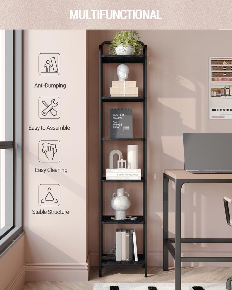 [Industrial Fashion Design]: The stylish bookshelf combines a curved top and a metal frame. A refreshed design showcases your high-end and unique taste; The curved corners prevent your product from falling off easily, ensuring your and your family's safety. The modern style design of the shelves seamlessly blends with your bedroom, office, and entrance. [ High Quality Bookshelf ]: We choose a combination of high-quality carbon steel and P2 particle board for you. This bookshelf has a waterproof, durable, durable surface, and rich wood texture, making it easy to clean. The load-bearing capacity of each panel is 30 lb. Adjustable feet can keep the device level on uneven floors, preventing scratches on the ground. [ Multi Functional Bookase ]: The upright bookshelf occupies the least amount of floor space and maximizes the utilization of different small areas. The function of this bookshelf is not limited to organizing books, its open bookshelf design can better display CDs and various decorations. In addition, this bookshelf is perfect as a kitchen/bathroom shelf to keep your counter free from clutter. [ Versatile Bookshelves ]: It is worth noting that if you are interested in obtaining two or more bookshelves, you can combine them in various ways to form a brand new large shelf to place items of various specifications, bringing you more assembly and usage experience. [ Safe and Easy to Assemble ]: Along with the book shelf, we will deliver you detailed instructions and all the necessary tools for assembly. Each component is labeled with letters, allowing you to assemble it within a limited time; Please remember to install anti tilt tools on the wall to improve stability and reduce accidental injuries. And several products can be combined to meet different spatial requirements.The shelves are made out of FSC-Certified wood