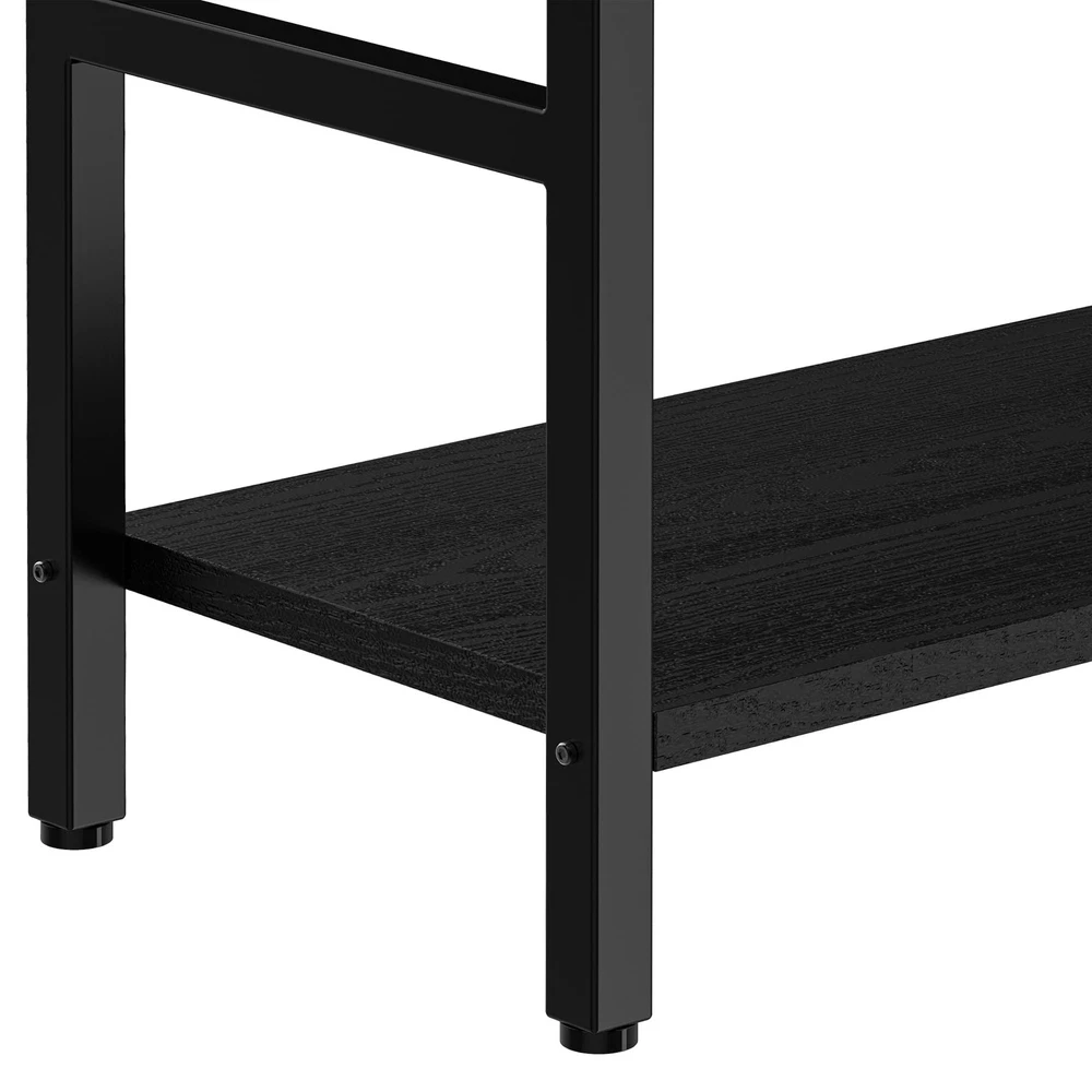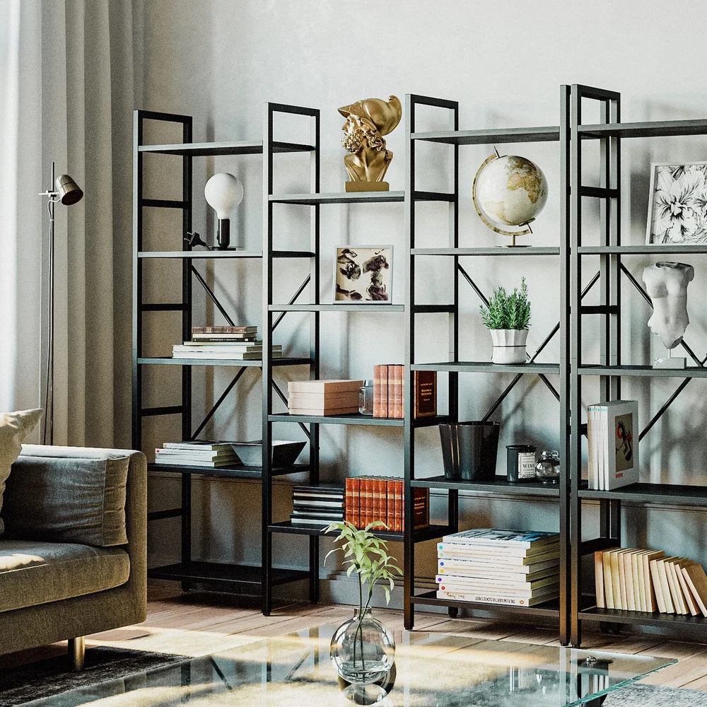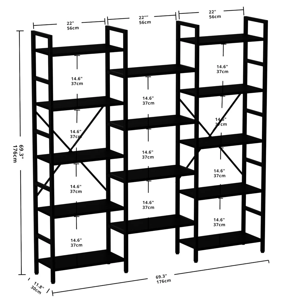 Size: 69.3" W x11.8" D x69.3" H. Each shelf of this storage book case can hold on to 66 lbs Features with 14 open shelves, this Triple Wide large display shelf can maximize the vertical storage space while keep your daily essentials in organize Made of solid MDF boards and stylish matte black iron brackets,the industrial color make this display rack well match your other furniture for your living room, bedroom, study or office Tipover Resistance Device prevent the bookshelf from toppling or wobbling Eight Large Iron Frame, Simple sructure, the clearly part numbers and installation steps make the assembly much easier The adjustable bottom small feet and X shaped brackets can keep balance and stability of the bookshelf