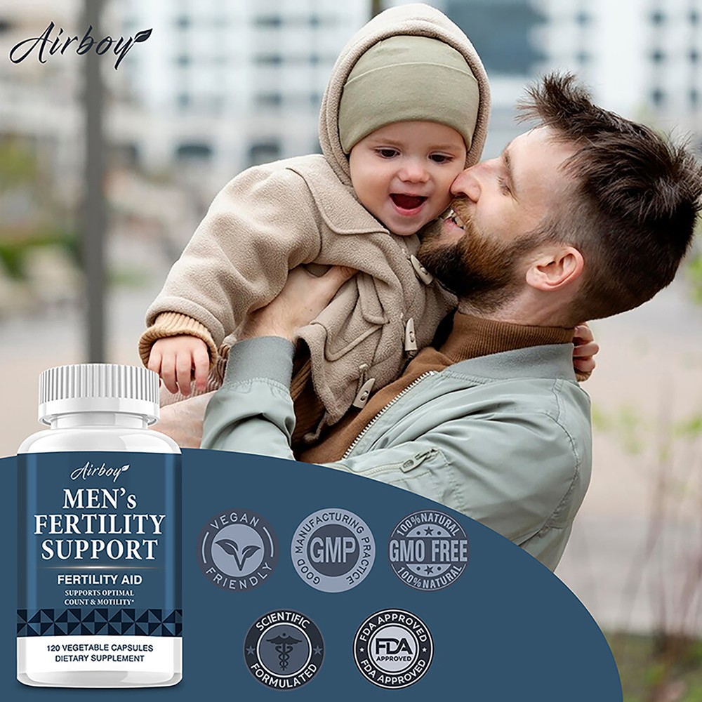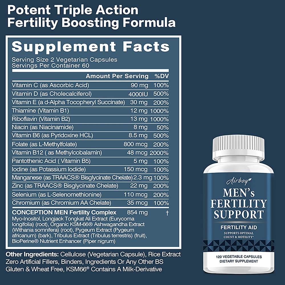 Effects: Male Fertility Support, Reproductive Health Ingredients: Myo-Inositol, Vitamin B, Vitamin C, Zinc Directions: Take 2 capsules once daily after a meal. Shipping: Ships within 48 hours on working days. Shelf life: 2 years Description: Reproductive Health: Fertility Support for Men contains over 14 vitamins and minerals to help support reproductive health including count, motility and strength. Supports Reproductive Balance: Our fertility aids support the reproductive cycle, aid conception, and fill nutritional gaps that may impact reproductive health: KSM-66 Ashwagandha, Magnesium, Zinc, Folic Acid, and Tribulus . Optimal Sperm Health: Our blend includes Ashwagandha and Inositol to support healthy testosterone levels, sperm count and motility, and promote overall reproductive health. Document