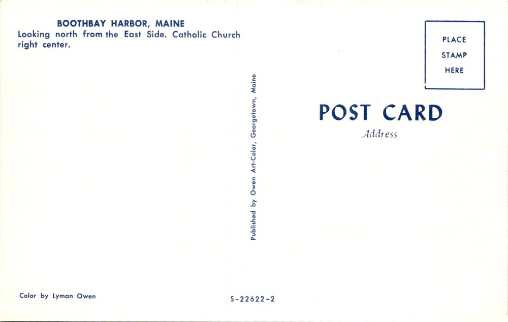MAKE AN OFFER. THE MORE YOU BUY THE BETTER DEAL I WILL ACCEPT This postcard features a view of Boothbay Harbor, Maine, looking north from the East Side. In the center of the image, the Catholic Church is prominently visible. The postcard was published by Owen Art-Color, based in Georgetown, Maine, with the colorization done by Lyman Owen.