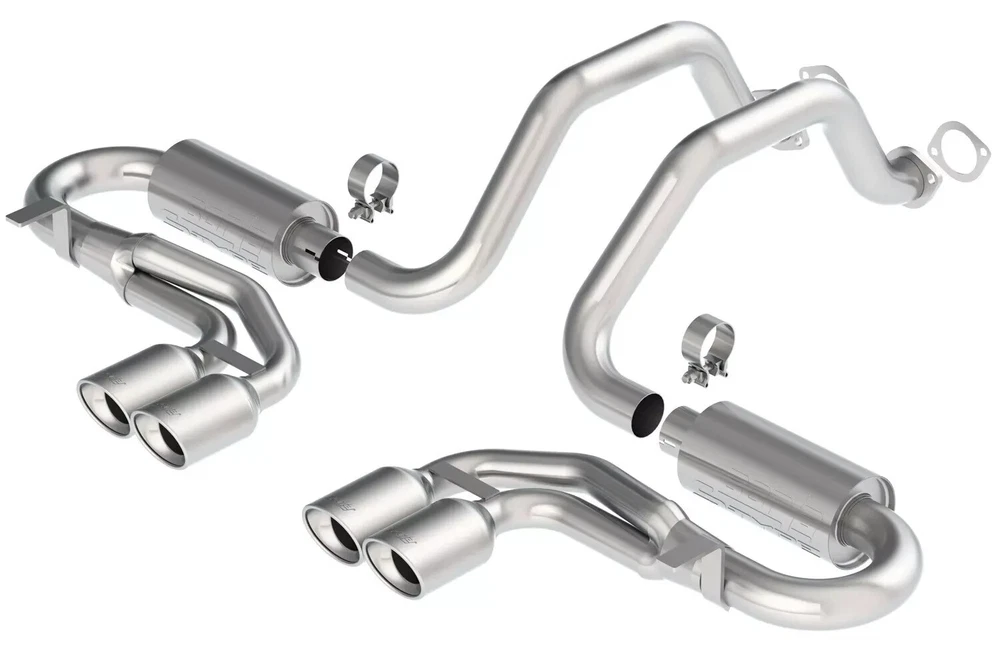 Borla S-Type Quad Exit Exhaust System + Tips Fits: 1997-2004 Chevrolet Corvette (C5)/ Corvette Z06 (C5) 5.7L V8 S-Type™ Stainless Steel Cat-Back Exhaust System with Quad Rear Exit by Borla. Exhaust System Type: Cat-Back. Exhaust Tubing Material: Stainless Steel. Main Tubing Diameter: 2.5" to 2". Exhaust System Sound: Aggressive / Loud. When you want the best performing, best sounding, and highest quality exhaust system, you want Borla Exhaust. Borla straight-through mufflers and mandrel-bent exhaust tubes are custom tuned to deliver the most horsepower possible, with a throaty, aggressive sound during acceleration and a definite performance tone at cruise. And the quality, aircraft-grade, austenitic stainless steel construction allows Borla to back every Cat-Back system with an unequaled million-mile warranty. Specifications: Exhaust System Type: Cat-Back Exhaust Tubing Material: Stainless Steel Exit Location: Quad Rear Main Tubing Diameter: 2.5" to 2" Exhaust System Sound: Aggressive / Loud Tip Quantity: 4 Tip Material: Stainless Steel Tip Outlet Diameter: 4.25" H x 3.5" W Tip Length: 6.75" Tip Shape: Oval Tip Style: Rolled Tip Cut Type: Angle-Cut Features: Aggressive Sound Increased exhaust flow for better performance Horsepower and torque increased by 7 – 10% Better fuel economy Definite performance tone at cruise with a throaty, aggressive sound during acceleration Made from the finest austenitic stainless steel for long-lasting durability All welded construction Borla Million-Mile Lifetime Warranty Proudly made in the USA Includes: Left side muffler assembly Left side over axle pipe assembly Right side muffler assembly Right side over axle pipe assembly (2) 2.5" Accuseal clamp (2) Flange Gaskets