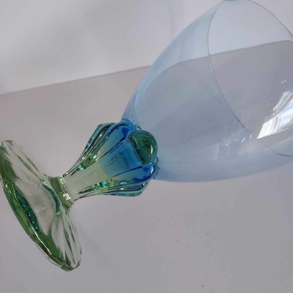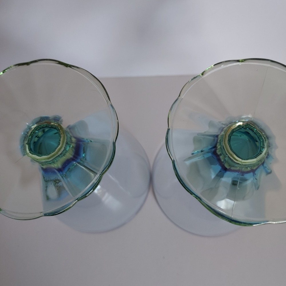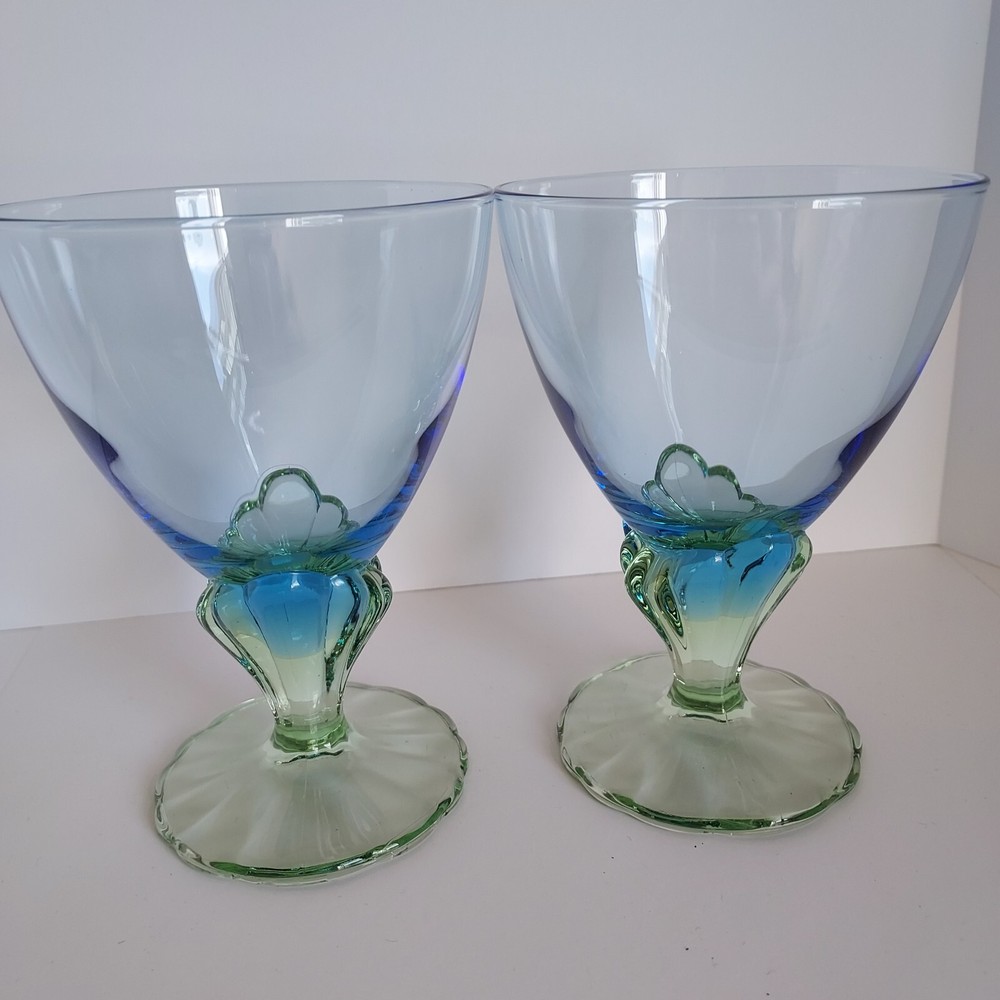 Beautiful blue and green hand blown glasses. They are 5.5 inches high and 4 inches at the widest point. Blue bowls and green textured Mermaid stems. They are in good pre-owned condition with no chips cracks or scratches.