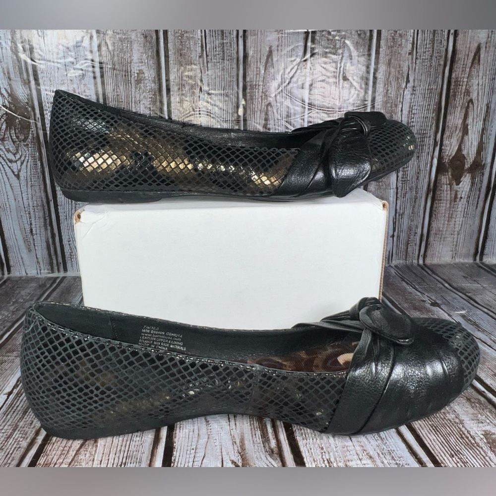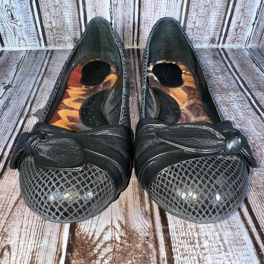 Born shoes are well known for their premium materials and supportive construction. Designed with a textured snake-embossed leather upper and a classic bow detail, these flats are both stylish and comfortable for everyday wear. Features: Size: 7.5 Genuine leather upper Snake-embossed black/gray finish Bow accent Cushioned footbed Durable rubber sole Condition: Pre-owned, gently worn. Light wear on soles consistent with normal use. Please review all photos.