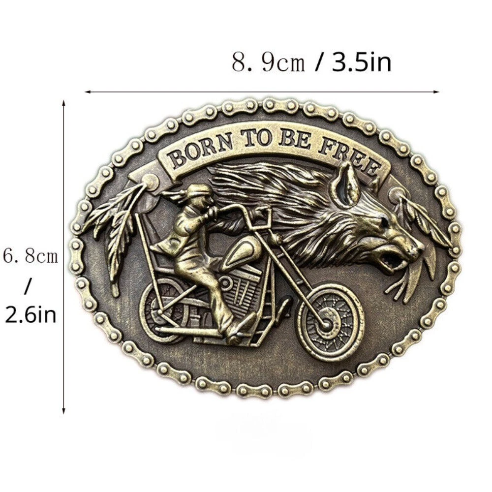 Show off your love for the open road with this Born To Be Free Motorcycle Rider Wolf Head Chain Edge Metal Belt Buckle. Crafted from high-quality zinc alloy, this Western Buckle is perfect for any American or Western-themed outfit. The buckle features a unique wolf design, adding a touch of style and personality to your look. Designed to fit a 1.5-inch belt width, this belt buckle is the perfect accessory for any motorcycle enthusiast or Western fashion lover. Its sleek and durable construction ensures long-lasting use, making it an ideal addition to your accessory collection.