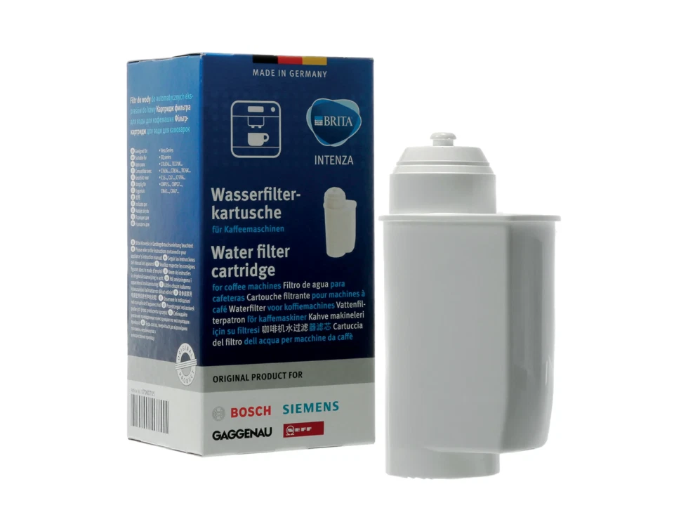 Bosch Brita Intenza 17000705 Water Filter for Coffee Machines 1) Water filter cartridge for coffee machines. 2) Protects your device from limescale, chlorine, lead and copper. 3) Improves the taste and aroma of your coffee. 4) Adjustable according to water hardness. 5) Always remove the filter before running your device in the descaling program and replace it after 50 litres of use (400 cups or every two months).