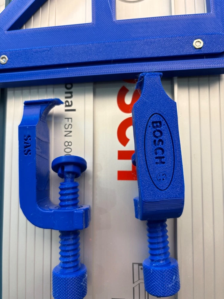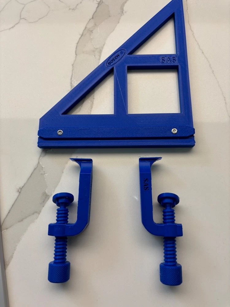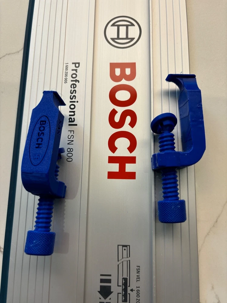 This is a 3 part bundle which will Improve efficiency of your guide rail / track saw setup Set will fit guide rails of the following make: Bosch What is included: (1) One 90 & 45 Degree Large Angle Bevel Guide Rail Stop (2) Two G- Style All In One clamp to fit the Guide Track - very easy to hold down material = perfect for worktops With regards to the large angle bevel Square: If you are looking to make and achieve perfectly square or angled cross cuts with your track saw (plunge saw), then this is what you need. This Track Saw Guide Rail Bevel Square is compatible with the guide rails of above mentioned brand to handle the most accurate and tight tolerances for top quality woodworking when cutting with a rail or track saw. This design fits perfectly to all lengths of profile guide rails of above mentioned brand Slide the Track Saw Square on to the rail and secure the rail to the square firmly in place, by gently tightening the two screws with an allen key Large fence area 90 degree 185mm - 45 degree 230mm to give a solid and sturdy reference Large slider to fit the guide rails to ensure its rock solid, and will give a positive connection Secured in place by two allen screws (included Slides in easy and out, without removing the slider. Increases user safety and reduces risk due to large reference area Please note that there is no OEM product available to do this With regards to the G-Style clamps G- Style clamp to fit the Guide Track from above mentioned brand - very easy to hold down material = perfect for worktops Excellent design and fit Cost effective - its all there, right out of the box This is a complete clamp, no additional stuff needed!! Technical Details Material: PLA Colour may vary (mostly Blue) Made in the UK 3d Printed Infill at 50 -70% Please Note: Guide rail not included