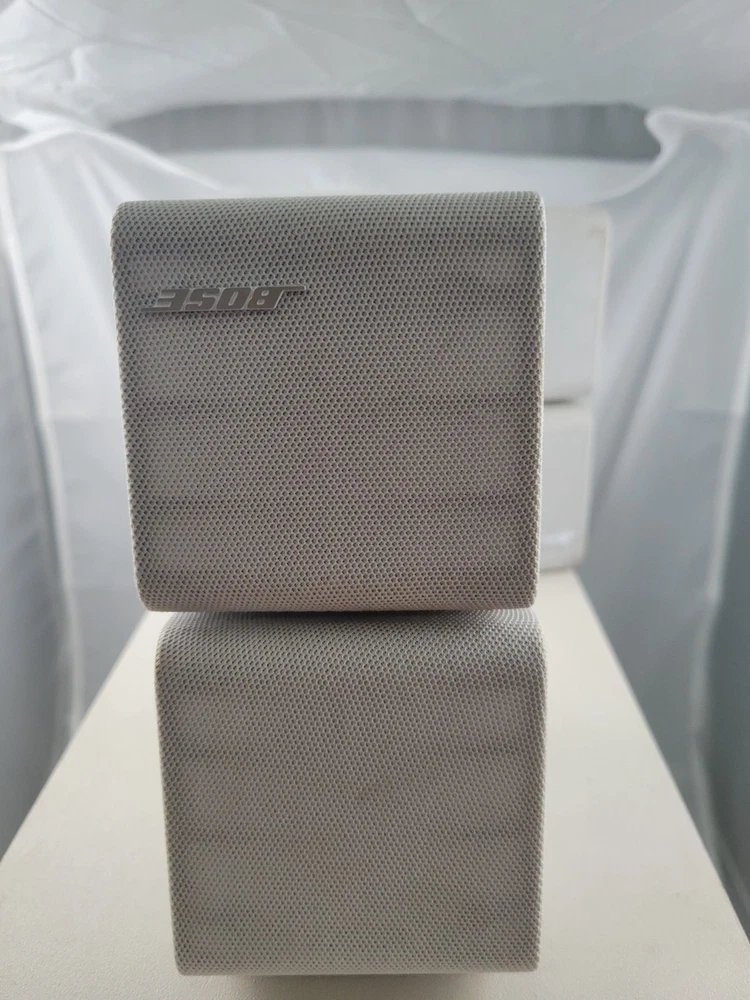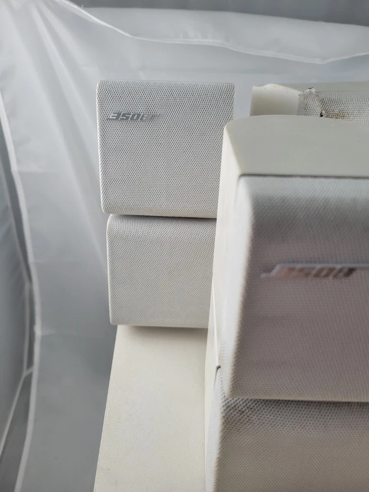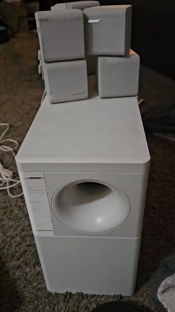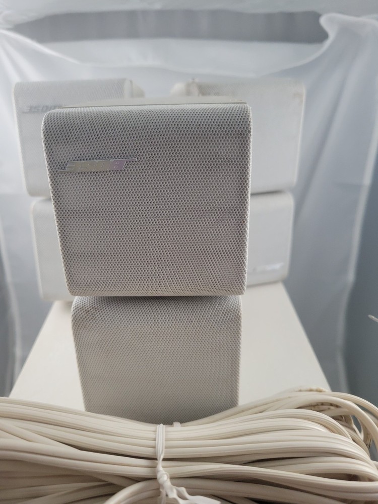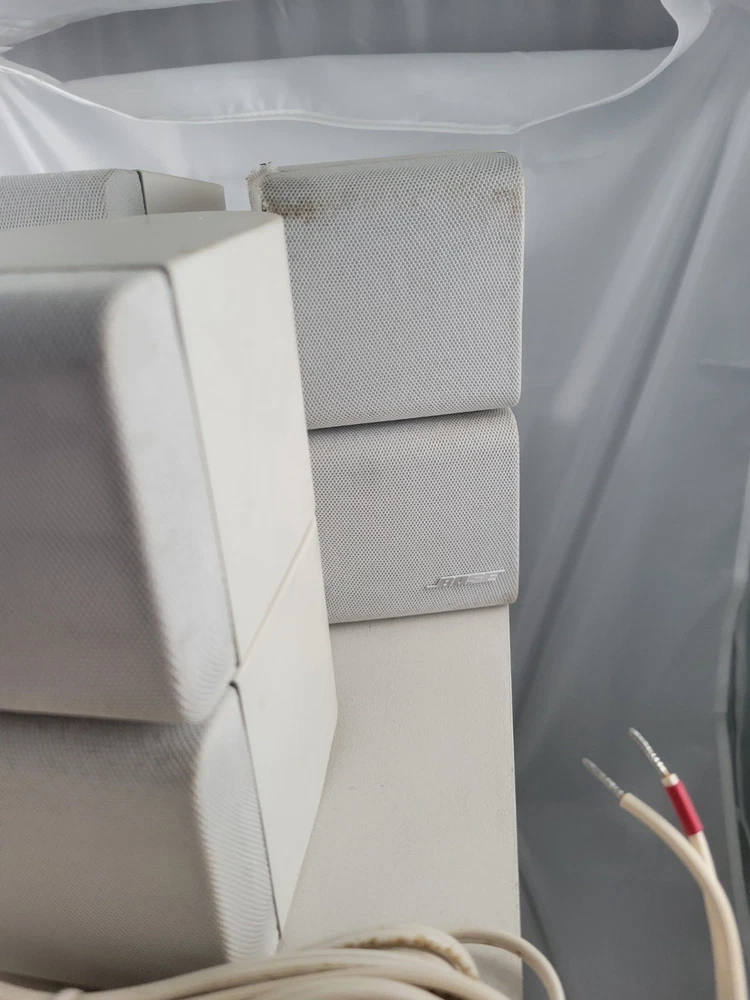 Bose Acoustimass 7 White Home Theatre Subwoofer Speaker Tested 3 Cubes VIDEO SEE VIDEO WORKS GREAT PLUS 3 CUBE SPEAKERS WIRES INCLUDED AND MANUAL IS ALSO INCLUDED ONE OF THE CUBES HAS SOME COSMETIC DAMAGE SEE PHOTOS BUT STILL WORKS