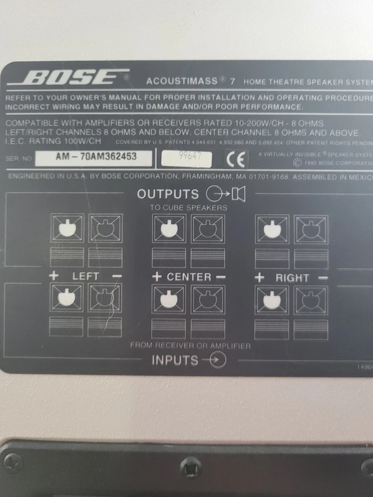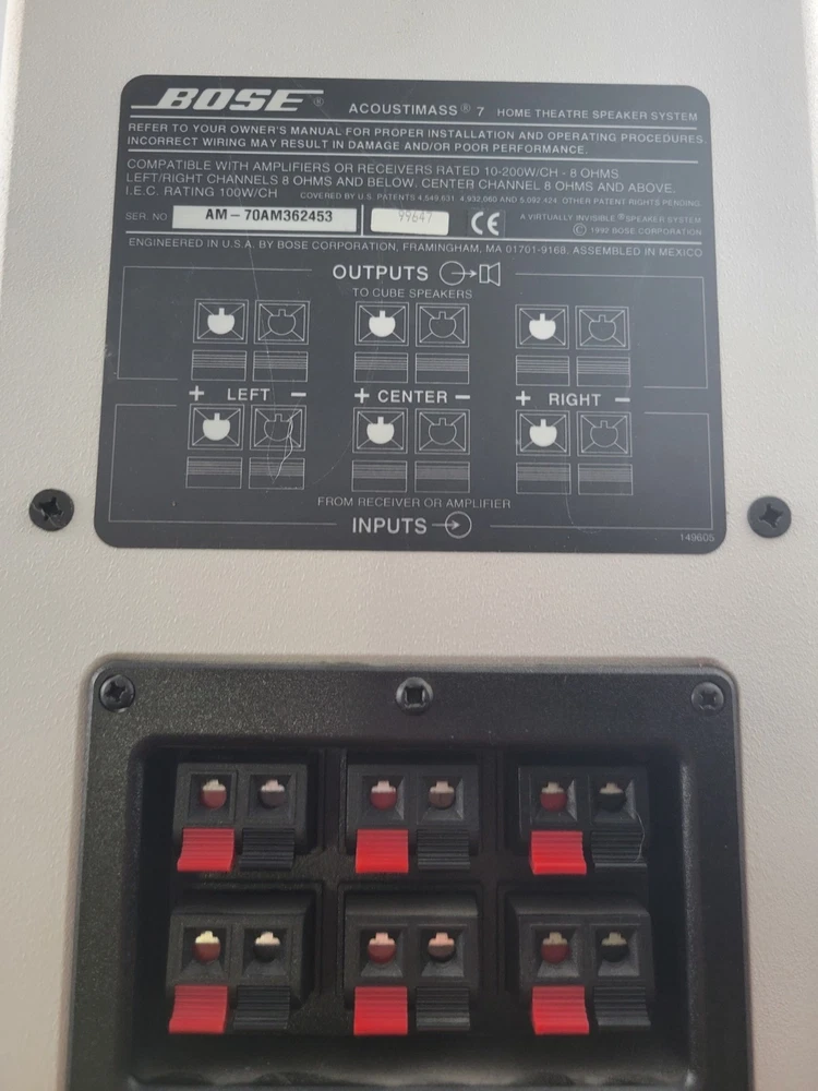 Connectivity: Wired MPN: Does Not Apply Surround Sound Formats: THX, Dolby Digital, Dolby Pro Logic Features: Bose quality performance Impedance: 8 Ohms Custom Bundle: No gtin13: Does not apply Item Length: 19 Item Height: 14 System Configuration: 1 + Subwoofer Item Width: 8 Model: Bose Acoustimass 7 UPC: Does not apply Driver Size: 10 in Color: White Audio Inputs: bare wire jacks Type: Passive Subwoofer Country/Region of Manufacture: Mexico Brand: Bose Item Weight: 20 Smart Home Compatibility: N/A Shape: Rectangular Compatible Brand: For Bose SKU: 561043 RMS Power: 200 W Compatible Model: Universal