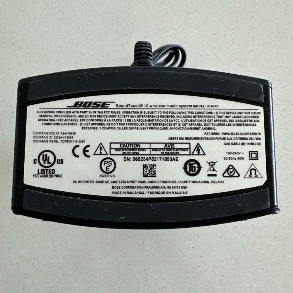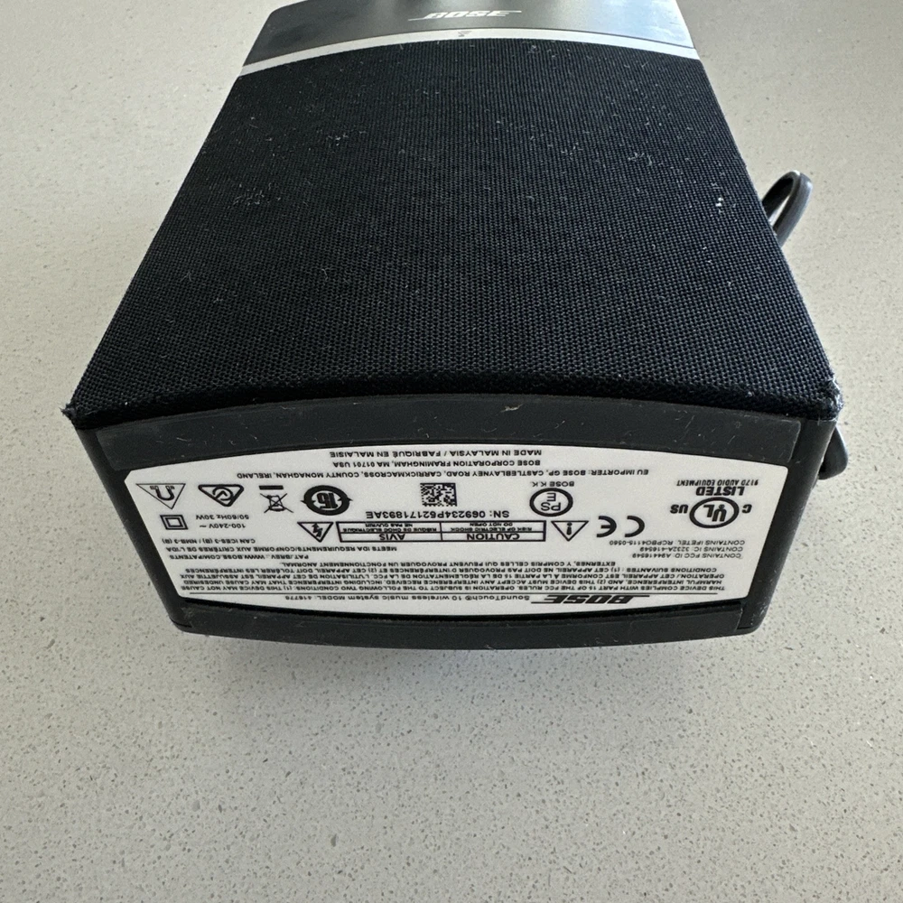 Comes with: Bose SoundTouch10 Electrical plug *small scuffs on corner of speaker see photo* This Bose SoundTouch 10 Wireless Music System is a must-have for any music lover. With its universal compatibility, this rectangular-shaped speaker system can be used with various brands and models. It boasts a powerful 30W RMS output and features Wi-Fi and USB audio inputs for a seamless listening experience. In addition, this speaker system comes in a sleek black color and has Bluetooth connectivity for easy wireless streaming. The Bose SoundTouch 10 is perfect for use in the home or on-the-go, and is sure to impress any audio enthusiast.