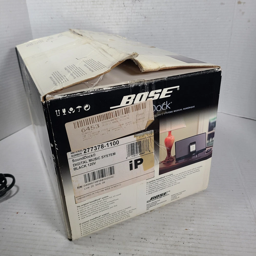 Type:Audio DockCompatible Brand:For AppleBrand:BoseFeatures:Remote ControlYear Manufactured:2010MPN:035703951010120AEShape:CubeConnectivity:WiredMaterial:PlasticColor:WhiteItem Weight:3.1 lbsCountry/Region of Manufacture:MexicoModel:Sounddock Digital Music SystemCompatible Model:For iPod ClassicPlug Regional Fitment:Type AAudio Inputs:3.5 mm Jack, AUX, iPod Dock