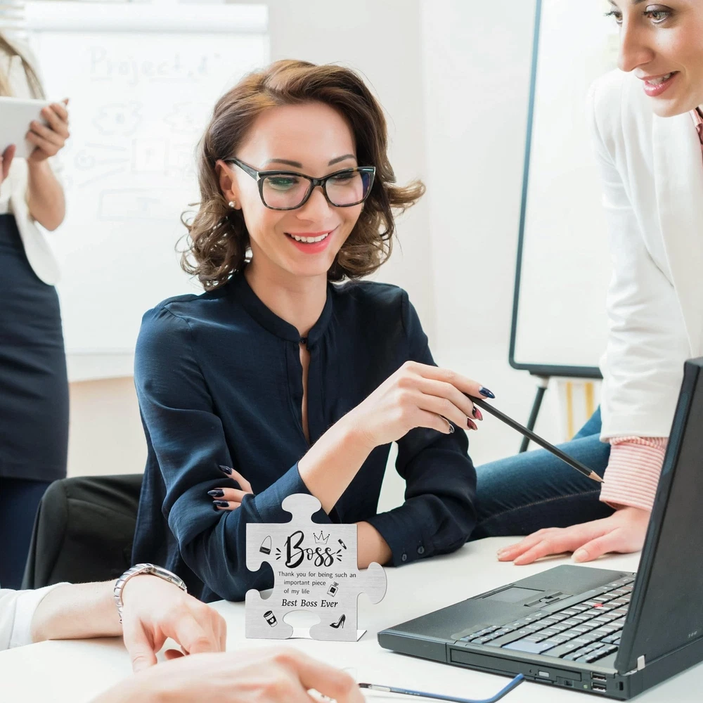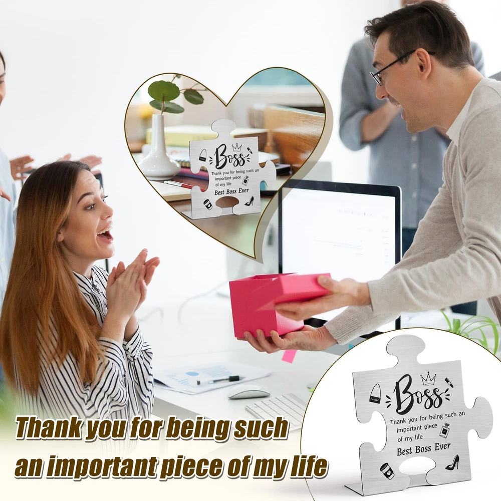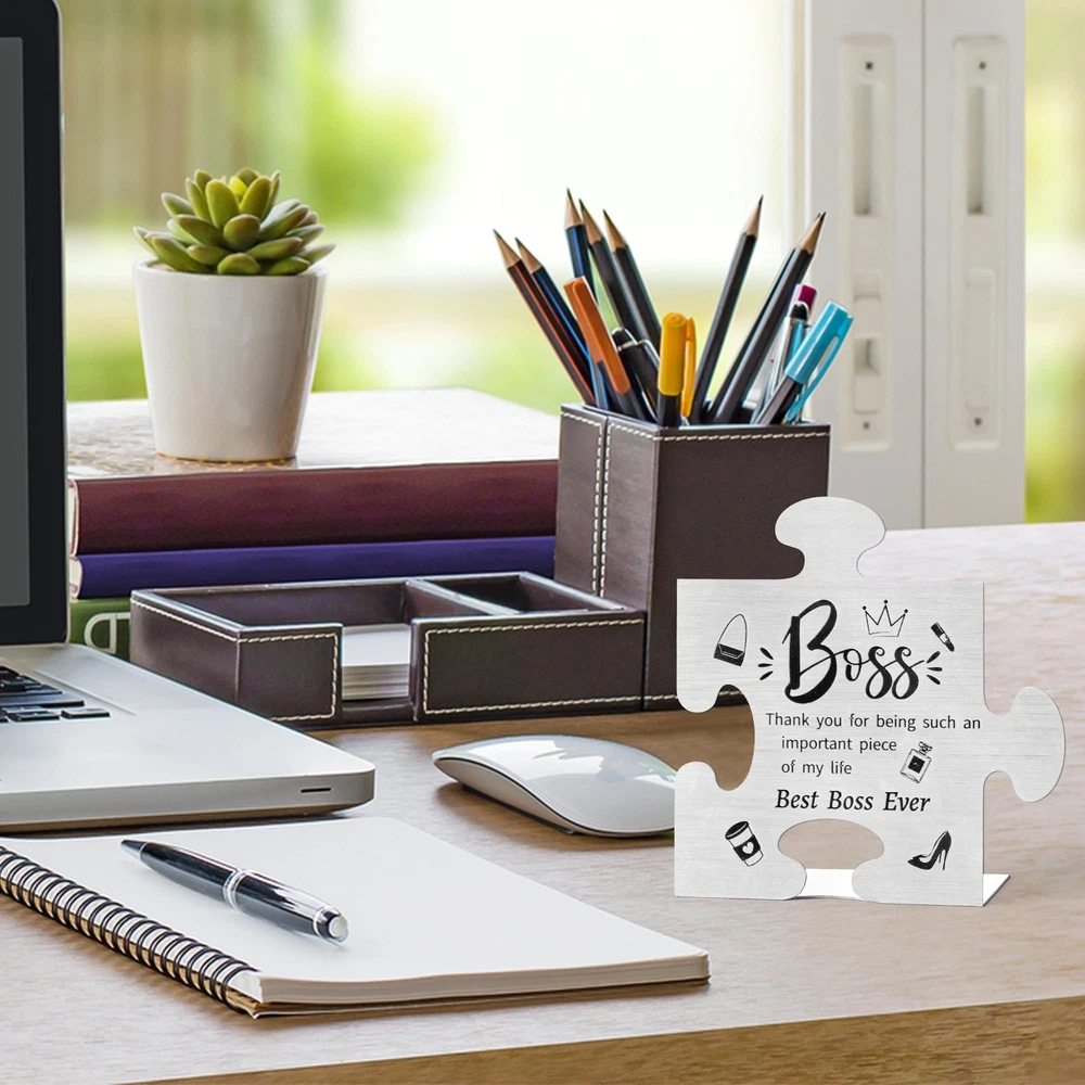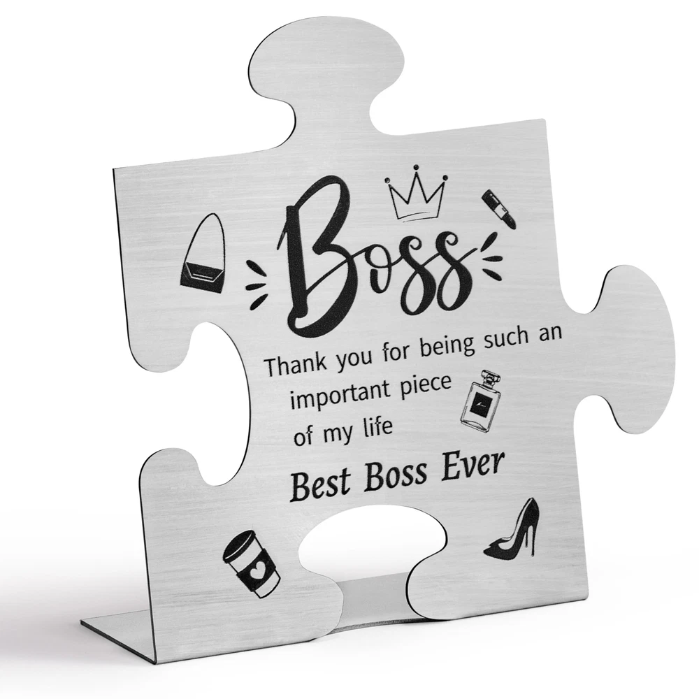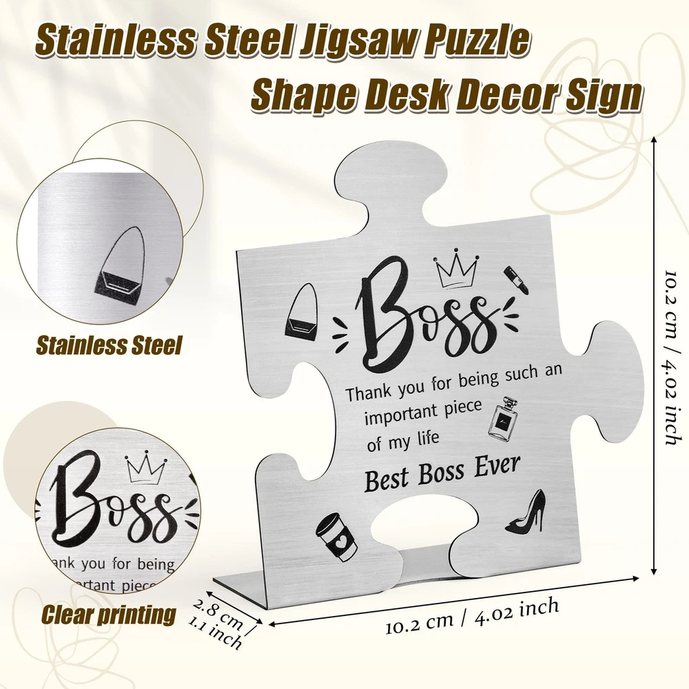 Boss Lady Gifts Desk Sign for Women - Pink Boss Lady Desk Sign Stainless Steel Office Gifts Boss Day Gifts Jigsaw Puzzle Decor Sign Coworkers Plaque Sign Gifts for Best Boss Birthday Thanksgiving Product Details Color: Silver Brand: EZdhuawuse Theme: Boss's Day Product Dimensions: 4.02"L x 4.02"W Style: Boss's Day Brand Name: EZdhuawuse Style Name: Boss's Day Theme: Boss's Day Color: Silver Item Dimensions L x W: 4.02"L x 4.02"W Distinctive Design: This jigsaw puzzle-shaped desk decor features an inspiring message, 'Thank you for being such an important piece of my life,' making it a thoughtful and surprising gift for your boss. Comes with a presentation box for a polished gifting experience High Quality MaterIal: Our products are made of stainless steel material, will not break, will not wear, will not rust, will not fade, easy to clean Be The Right Size: The size of our desk decor sign is 4.02 x 4.02 x 1.1 inches, you can decorate it on your desk, bedside table, windowsill, bookshelf, small and simple does not take up desktop space, objects are light and can be moved at will Applications: Our charming standing sign suitable as a nice gift for the lady boss, wife, mom, manager or friend to show your appreciation on her important occasions. It not only be placed on the office desk, but also on the bookshelf, windowsill, bedside table, fireplace for decoration, unique and beautiful Special Occasion Gift: Perfect for Boss's Day, birthdays, Thanksgiving, Christmas, holidays, retirements, promotions, farewell parties, or company anniversaries, this gift shows your respect and gratitude on any special day