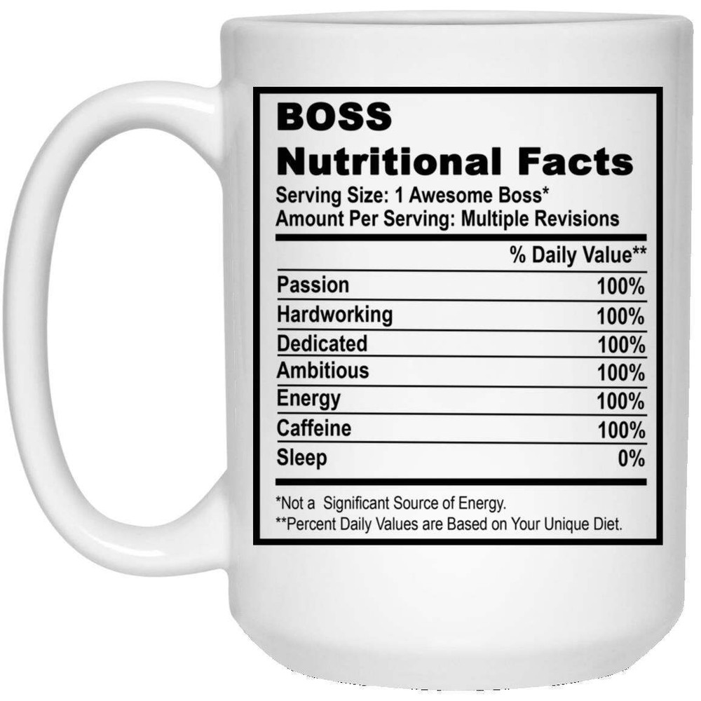 Boss Nutritional Facts Coffee Mug Nutritional Facts Funny Coffee Mug Funny Gift Product Details.. This high quality 11oz. ceramic white mug has a premium hard coat that provides crisp and vibrant color reproduction sure to last for years. Perfect for all hot & cold beverages. The highest quality printing possible is used. It will never fade no matter how many times you wash it. Material: 100% Ceramic. Print both sides. Dishwasher and Microwave Safe. High Gloss + Premium White Finish. Printed in the U.S.A. Personalized & Custom. We support personalized and custom mug to add custom, when placing an order, you can add notes to the "order note" in shipping address section. Also you can contact us directly via message. Shipping Info. Ready to ship in 1 to 2 business days, All products are made-to-order and proudly printed in the United States. Shipped by USPS and DHL, You will receive your order in 5-7 days. Replace & Refund. All products are defective during shipping broken, chipped will be replaced free of charge. You are not satisfied with the product, we will refund 100% money to you. If any other issues arise, please do not hesitate to message, we would be more than happy to assist you.