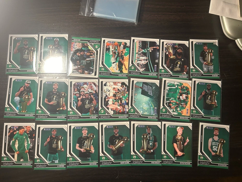 Boston Celtics 2023-24 Panini Instant NBA Finals Lot Of 21 Cards. Missing Jordan Walsh RC, Kristaps Porzingis base card, Kristaps Porzingis returns, Joe Mazzula base, Luke Kortnet base, Celtics logo Pritchard have court Jaylen brown dunk and drew Peterson RC. See photos. Feel free to send me an offer. Some cards have some corner damage