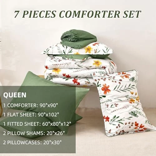 Return Policy Fast Delivery Trusted seller Botanical Comforter Set Queen Size,7 Pieces Bed in a Bag Floral Leaves Pattern on White Bedding Set Soft Microfiber Bedding Comforter Set for All Season with Sheet,Pillowcases&Shams Product Description [7 PIECES BED IN A BAG]: This green comforter set include 7 Pieces: 1 comforter set(90”x90”)+2 pillow shams(20”x26”)+2 pillowcases(20”x30”)+1 fitted sheet(60”x80”+12")+1 flat sheet(90”x102”) [FLORAL REVERSIBLE PATTERN ]: This botancial comforter adopts a reversible design. A side is a colorful floral design that looks colorful and adds a bright and lively atmosp to your bedroom, suitable for all ages. B Side is fresh and pure green. Soft color combinations make your bed look more luxurious. [ULTRA SOFT MICROFIBER MATERIAL]:This botanical bedding comforter set used the whole piece of polyester as the filling of the comforter which makes the comforter more soft and warm. It is more comfortable and breathable to use, skin-friendly, smooth to the touch, and fade-resistant. High density stitches make sure to avoid the comforter to shifting and clumping. [EASY TO CARE]:This bed in a bag queen polyester microfiber high quality fabric, easy care, low temperature machine wash, never fade, wrinkle free, dustproof, easy to remove pet's fur. Our comforter set can be used directly without a quilt cover, which is more convenient to use. [WARM TIPS]: As the comforter set is packed in vacuum bags, it is recommended that you dry the comforter set in the sun and gently tap the quilt to make it fluffy again. Shipping Returns Payment Shipping Shipping is FREE to all addresses other than APO/PO boxes in the lower 48 states. All our stock ships from US-based warehouses. Shipped via USPS or UPS (depending on location and package weight) Unless stated otherwise, all orders will ship within 24-72 hours of your payment being processed. Check our feedback to see the great reviews of FAST shipping we offer. Returns Seller does not accept returns Payment We currently accept payment via eBay managed payments only. Once payment is cleared, we will dispatch your shipment within 1-3 business days. Please refer to the "Shipping" tab for more information regarding shipping speed to your destination.