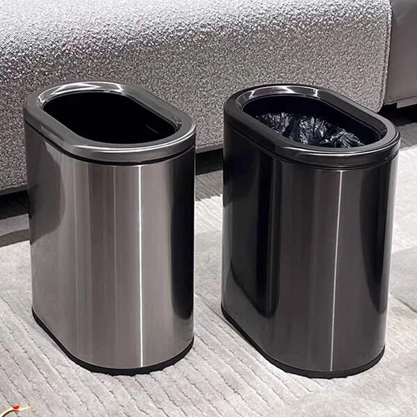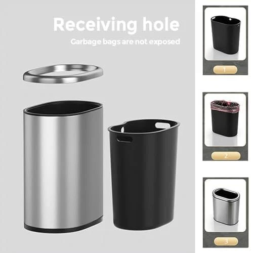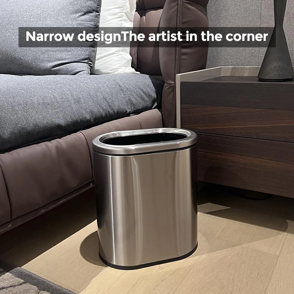 Narrow design:The oval shape makes this trash can both practical and beautiful,This is a perfect narrow trash can,Perfect for bathroom use. Fashionable appearance:The simple and stylish exterior design is suitable for various home styles and enhances home aesthetics. Product Material:The trash can is made of high-quality stainless steel material, the appearance is simple and fashionable, the appearance is smooth, and it is very modern. Protects Your Flooring:The rubber feet pads on the bottom of the trash can will help prevent scuffs and scratches to your floor Easy to Clean:Trash bin,The bottom is heightened to reduce wear and prolong the service life. The surface frosted texture is wear-resistant and scratch-resistant Perfect ERFECT Size:Bathroom Trash can, 12.05 x 7.76 x 13.66(inches), 2.4 gallon/9 L
