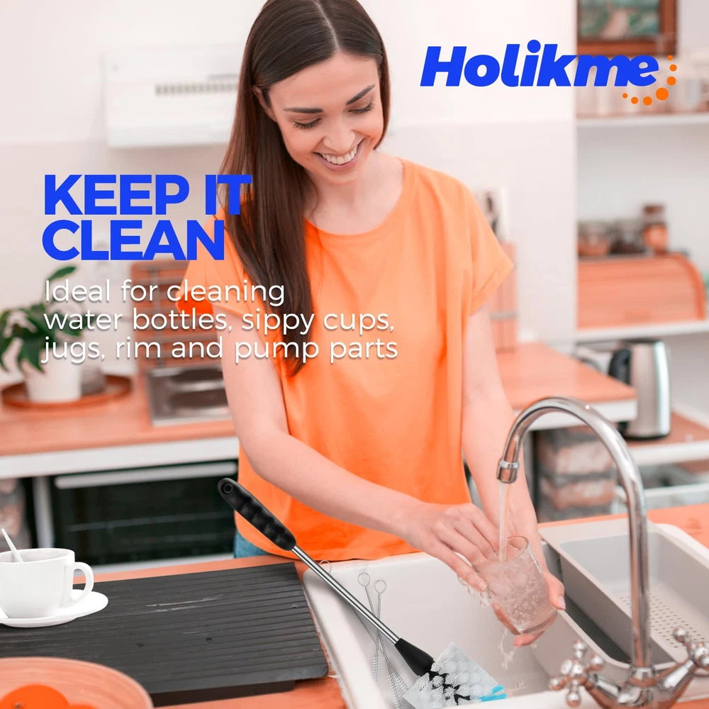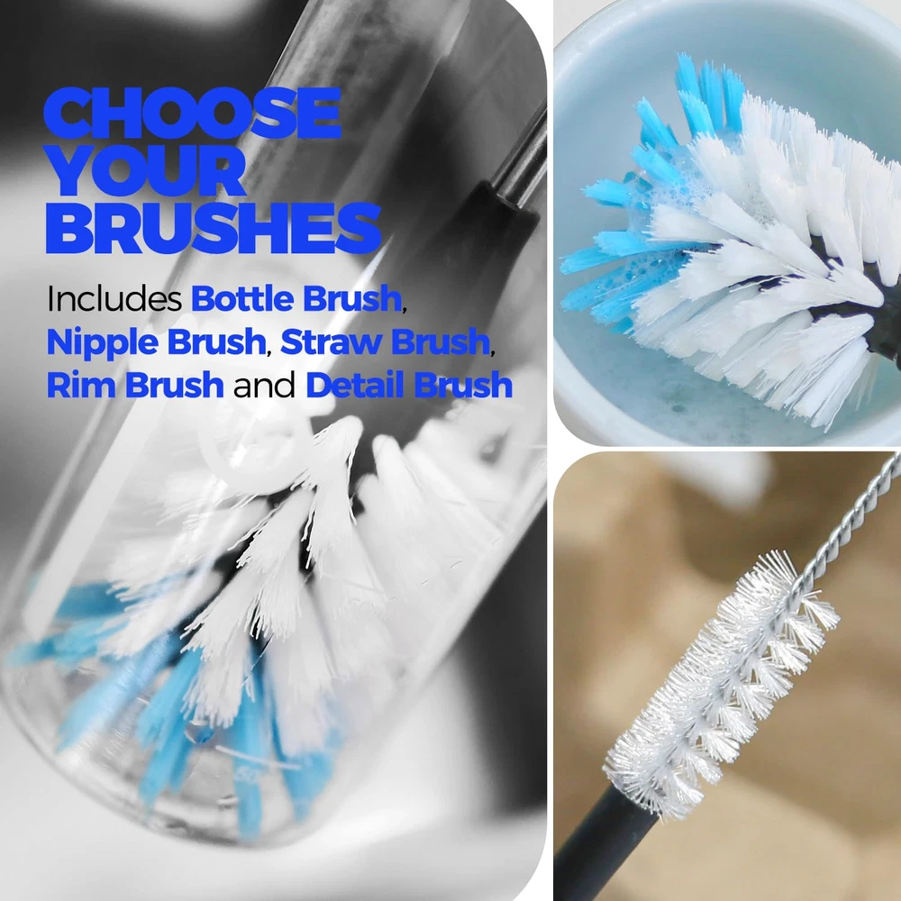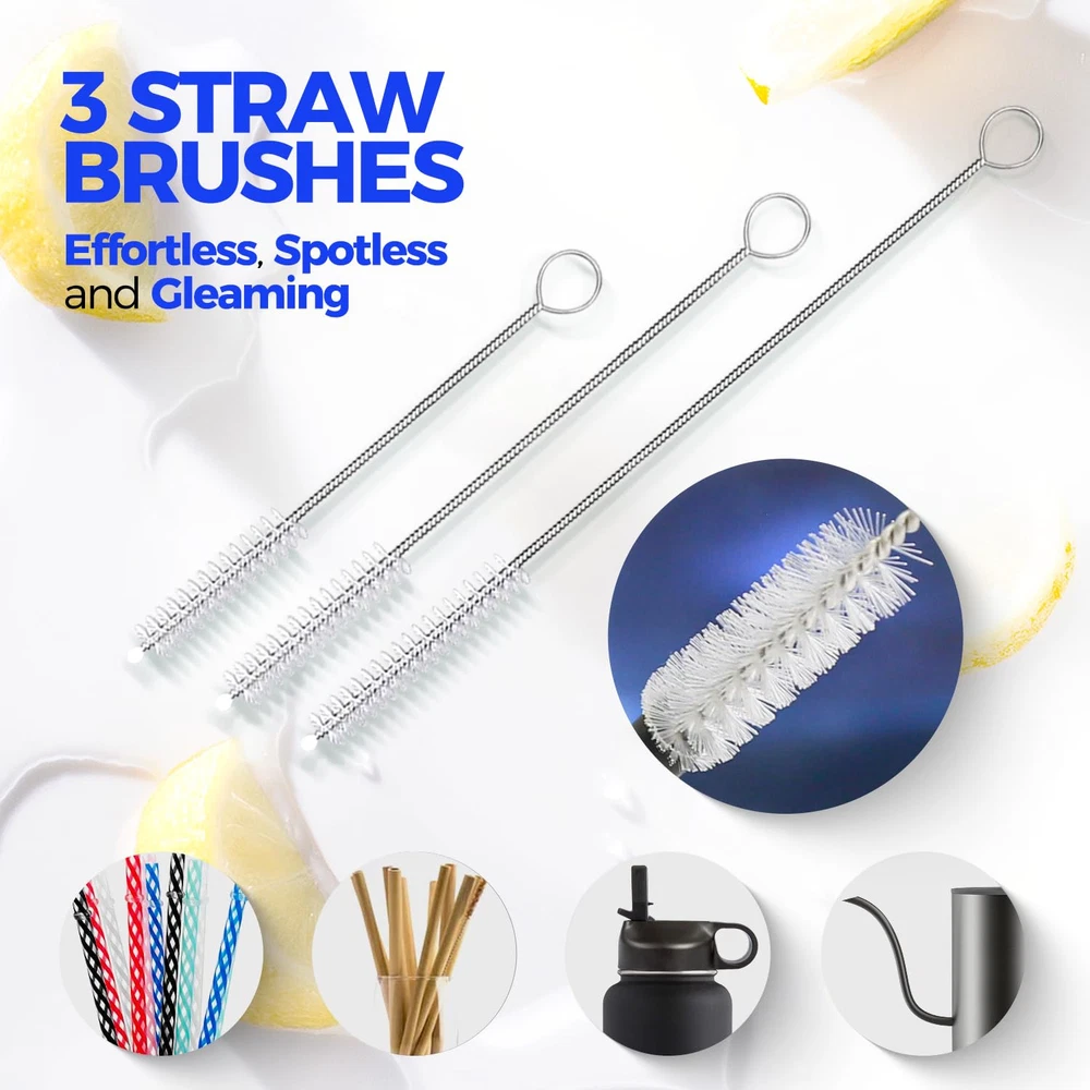 【4 PACK BOTTLE BRUSH SET】Includes 14" bottle brushes with stainless handle, 3×straw brushes. With this complete set of cleaning tools, you'll have everything you need to keep your drinkware sparkling clean and ready to use. 【BOTTLE BRUSHES WITH LONG STANINLESS】Measures 14" and non-scratch and odorless nylon bristle (soft black for gentle cleaning, stiff grey for serious scrubbing) easily removes stubborn stains from your bottles, carafes, travel mugs, containers etc. Its sturdy construction make tough cleaning tasks a breeze. With the non-slip rubber grip of this bottle scrub brush, you can clean your bottles with ease and comfort. 【3 STRAW BRUSHES】Varying lengths 7.9", 9.8", 11.8" and a diameter of 0.4". Designed to cater to different straw types, such as metal, plastic, and straw lids. Keep your straws clean, hygienic and debris-free, whether reusable or disposable. 【Safe and Hygienic Usage】This bottle brush set is made from food-grade polypropylene, ensuring it doesn't produce any peculiar odors. It is considered safe for your children and is a fantastic addition to your kitchen or a great gift option. You can easily store it in a kitchen caddy or hang it by its handle from a hook. Plus, it is dishwasher safe for added convenience. 【Powerful Cleaning Performance】Experience unmatched cleaning power, as our bottle cleaning brush efficiently tackles residue and grime, ensuring a spotless finish every time.