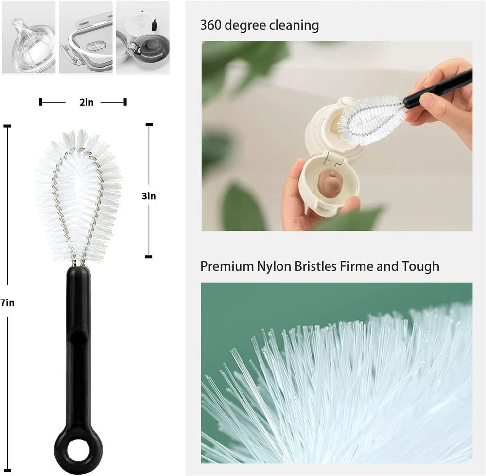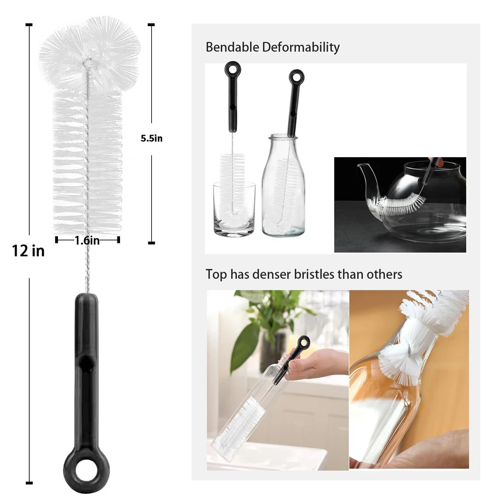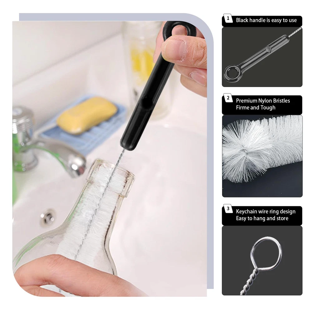 【Assortment】 bottle cleaning brush kit includes 1 pcs 12in water bottle cleaning brush, 1 pcs 360-degree clean lid brush and 5 pcs straw cleaner brushes in different sizes. Total 7 pcs are chained together with a keychain.baby bottle cleaner set help you with a true 360-degree cleaning 【High Quality and Durable】 bottle scrubber brushes is made of hard nylon bristles and rust-resistant stainless steel, which is easy to clean and does not rust and lint. The top of the metal straw cleaner brush has a scratch-resistant design. Last but not least, the handle of the bottle brush is sturdy and easy to grip 【Bendable Deformability】 stainless steel straw cleaner brush extra long is deformable and can be bent into any shape, it also holds the curved shape well, so bottle brushes long handle are easy to enter any hard-to-reach space, from this set of water bottle brushes for cleaning you will always find the right tool to clean crevices and hard to reach corners 【Widely Use】 If you need a bottle cleaner set to clean your favorite water bottle, ours will do it.bottle brush set is suitable for many kinds of tube cleaning, for bottle, wine/ beer bottles, baby bottle cleaner, straw, narrow and wide-neck pipe, mason jars,teapot, coffee machine and pot, hookah, flower vases,sink drain, weed smoking bong, hummingbird feeder, computer keyboard 【Customer Satisfaction】 Contact us if you have questions or concerns about your pack of water and baby bottle cleaner brushes.Our team is always available and happy to help