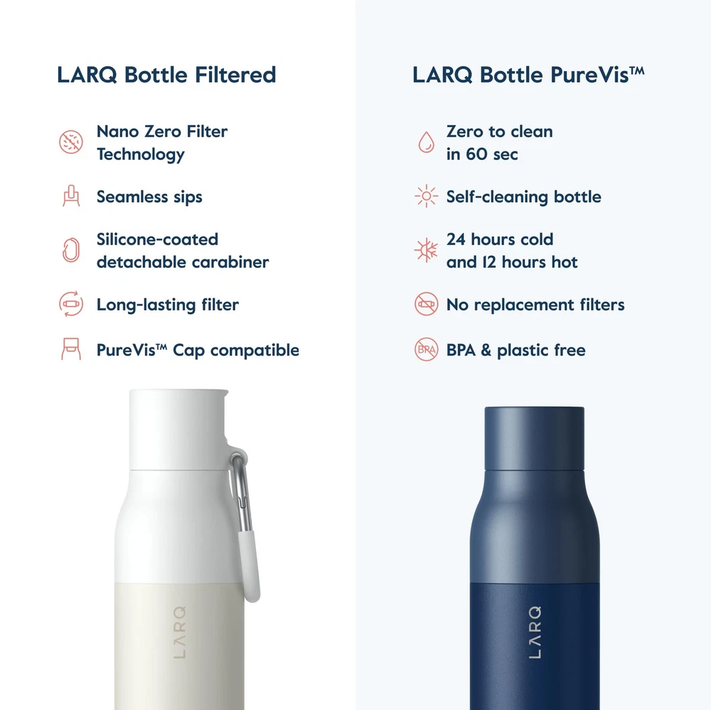 A revolutionary portable water filtration system that combines a high-performance Nano Zero filter with a seamless, low-pressure drinking experience. BEST-IN-CLASS FILTRATION – Improves taste for a smooth finish and removes lead, heavy metals, chlorine, and particulates that meet NSF/ANSI 42 & 53 standards. NANO ZERO FILTER TECHNOLOGY – Our filters have two layers – activated carbon and Nano Zero technology. Activated carbon traps contaminants like chlorine and VOCs while Nano Zero grabs onto heavy metals for pure, great-tasting water. Please note that the filter will take up 2.5 ounces of the overall bottle volume. LONG-LASTING FILTERS – Filters up to 40 gallons (151 liters) of water or 2 months of use - this equals to 300 single-use plastic bottles. Filter included with the bottle. EXTRA FEATURES – Easy-to-drink low-pressure straw allows for seamless sips. Let the bottle do the work for you. Silicone-coated detachable carabiner makes on-the-go hydration that much easier. Double-wall insulated BPA-free stainless steel build keeps your water cold for up to 24 hours. RED DOT 2022 AWARD WINNER – The luxurious environmentally-friendly powder-coat finish provides a subtle texture for a better grip. WARRANTY - We offer a 1-year limited warranty to repair or replace any defective material or component. It does not cover any issues due to normal wear and tear, misuse or loss / theft of the product. Note: The Bottle Filtered does not feature our built-in PureVis technology.
