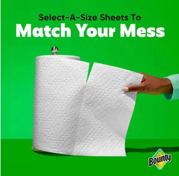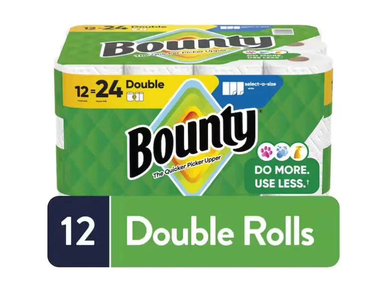 About This Product Spilled your drink. Quick! The Quicker Picker Upper. Be ready to tackle messes and spills with Bounty Paper Towels! Each sheet is 2x more absorbent, so you can use less and pick up spills and messes quicker than the leading ordinary brand. That's why Bounty is the Quicker Picker Upper! Bounty Paper Towels are available in 2 sheet sizes, Full Sheet and Select-A-Size, so you can choose which option works best for you. Bounty Select-A-Size towels are versatile, so you can choose your sheet size depending on your mess. and if you're buying the bigger packs, you'll always have Bounty on hand. Bounty has a variety of pack and roll sizes to fit your needs. Bounty products are proudly made with American jobs and we're fully committed to creating solutions for a sustainable future. Across all our products, we consider the impact on people, forests and the world. That's why for every tree we use, at least 2 are regrown so you can conveniently and confidently clean messes in the kitchen and around the house knowing Bounty Paper Towels is helping to keep forests greener. Bounty always has your back in and out of the kitchen so whether it's juice on the counter or ice cream on the table, we make sure spills won't stand a chance. vs. leading ordinary brand. Highlights Pack contains 12 double rolls of white Bounty select-a-size paper towels More absorbent so you can use less vs, leading ordinary brand Picks up messes quicker vs, leading ordinary brand With select-a-size rolls you can choose your sheet size based on the size of your mess 12 double rolls is equal to 24 regular rolls Most awarded paper towel based on online media awards for the past 6-years Now more clothlike vs, previous product Why use more when you can use less versus leading ordinary brand Shop all Bounty products here