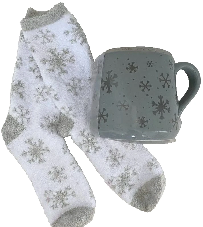 NEW WITH TAGS Boutique gray glossy ceramic silver snowflake coffee mug and white and gray snowflake print socks. Ultra soft and fluffy socks to keep you warm while drinking your tea, cocoa or coffee. Makes a great gift. Inv: 729103-05