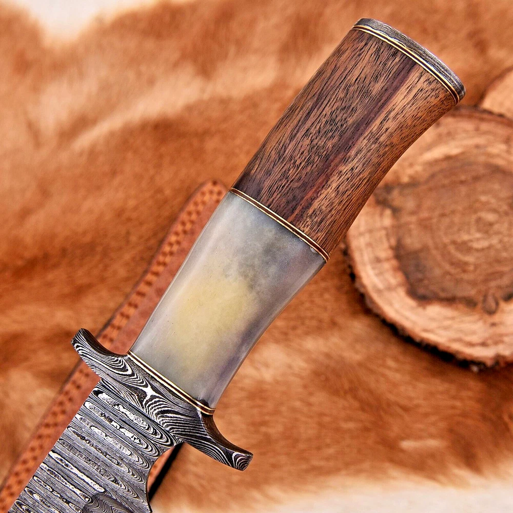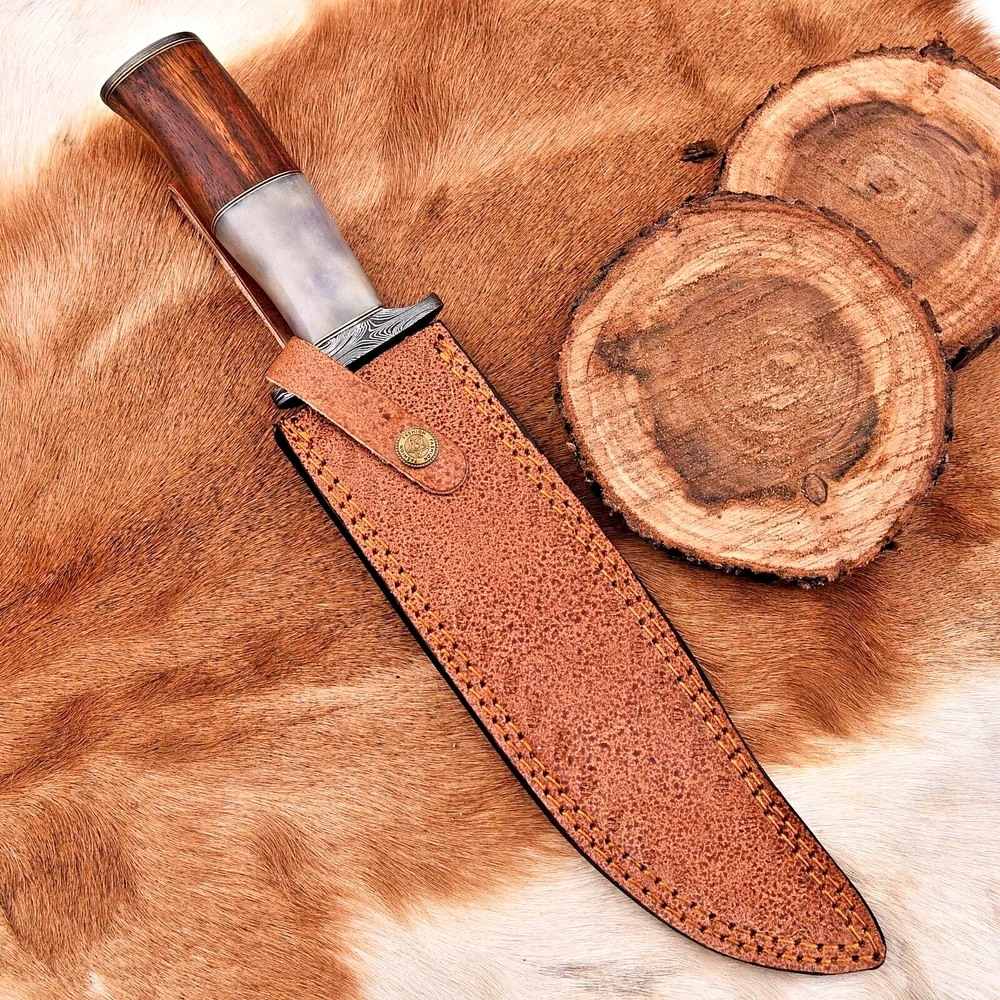 CUSTOM HAND MADE HAND FORGED DAMASCUS STEEL BOWIE HUNTING KNIFE SURVIVAL CAMPING HIKING BUSHCRAFT CAMEL BONE & WOOD WITH DAMASCUS STEEL GUARD HANDLE This superb design knife is hand forged. Blade of this knife has a nice file work and is made of 512 layers of 4340 stainless steel and 1075 high carbon steel and hardness 55-58 HRC . This robust knife is lab tested under intense conditions, the balance and shape of this knife ensures perfect grip. Overall Length: 15" Inches Blade Length: 10" Inches Handle Length: 5" Inches Damascus Design: Ladder Pattern Layers: 512 Package Includes: with Sheath Care Instructions: Keep the knife dry after each cleaning. Warning: Keep fingers clear of blades. Store away from children.