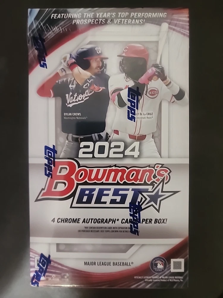 Bowman Best 2024 4 Chrome Autograph Sealed 2024 Bowman's Best Baseball Hobby Box 2024 Bowman& Configuration: 12 packs per box. 5 cards per pack. PRODUCT HIGHLIGHTS - Only the best make the cut in this year’s Bowman’s Best release, spotlighting the game’s top performers. - Collect the entire 100-card Base Set featuring the BEST superstars, rookies, and prospects from around baseball. Box Break: - 4 Chrome Autographs - 12 Base Card Refractor Parallels PRODUCT DESCRIPTION BASE CARDS Parallels - Refractor Parallel – 1 Per Pack - Wave Refractor Parallel – 1:12 Packs - Mini-Diamond Refractor Parallel - #’d to 299 - Purple Refractor Parallel - #’d to 250 - Purple Mojo Parallel - #’d to 250 NEW! - Aqua Lava Refractor Parallel - #’d to 199 - Blue Refractor Parallel - #’d to 150 - Blue X-Fractor Parallel - #’d to 150 NEW! - Green Refractor Parallel - #’d to 99 - Green Mini-Diamond Refractor Parallel - #’d to 99 - Yellow Lazer Refractor Parallel - #’d to 75 NEW! - Gold Lava Refractor Parallel - #’d to 50 - Gold Refractor Parallel - #’d to 50 - Orange Refractor Parallel - #’d to 25 - Black Refractor Parallel - #’d to 10 NEW! - Red Refractor Parallel - #’d to 5 - Red Lava Refractor Parallel - #’d to 5 - SuperFractor Parallel - #’d 1-of-1 INSERT CARDS 1955 Bowman Anime – Limited NEW! - Black Refractor Parallel – #’d to 10 - Red Refractor Parallel - #’d to 5 - SuperFractor Parallel - #’d 1-of-1 2024 MLB All-Star Futures Game – (1:30 Packs) NEW! - Lava Refractor Parallel - #’d to 50 - SuperFractor Parallel - #’d 1-of-1 Strokes of Gold – (1:288 Packs) NEW! Fabled Phenoms – (1:6 Packs) NEW! - Mini-Diamond Refractor Parallel – Limited - Lava Refractor Parallel - #’d to 50 - SuperFractor Parallel - #’d 1-of-1 Impact Players – (1:12 Packs) NEW! - Mini-Diamond Refractor Parallel – Limited - Lava Refractor Parallel - #’d to 50 - SuperFractor Parallel - #’d 1-of-1 Best Ballers – (1:6 Packs) NEW! - Mini-Diamond Refractor Parallel – Limited - Lava Refractor Parallel - #’d to 50 - SuperFractor Parallel - #’d 1-of-1 Bowman Showpieces – (1:18 Packs) NEW! - Mini-Diamond Refractor Parallel – Limited - Lava Refractor Parallel - #’d to 50 - SuperFractor Parallel - #’d 1-of-1 AUTOGRAPHS Best of 2024 Autographs - Refractor Parallel - Blue Refractor Parallel - #’d to 150 - Green Refractor Parallel - #’d to 99 - Gold Mini-Diamond Refractor Parallel - #’d to 50 NEW! - Gold Refractor Parallel - #’d to 50 - Orange X-Fractor Parallel - #’d to 25 NEW! - Orange Refractor Parallel - #’d to 25 NEW! - Teal Refractor Parallel - #’d to 15 NEW! - Black Refractor Parallel - #’d to 10 NEW! - Red Refractor Parallel - #’d to 5 - Red Lava Refractor Parallel - #’d to 5 - SuperFractor Parallel - #’d 1-of-1 - Printing Plates - #’d 1-fo-1 Dual Autographs – #’d to 75 - Gold Refractor Parallel - #’d to 50 NEW! - Orange Refractor Parallel - #’d to 25 NEW! - Red Refractor Parallel - #’d to 5 NEW! - SuperFractor Parallel - #’d 1-of-1 Triple Autographs – #’d to 75 NEW! - Gold Refractor Parallel - #’d to 50 NEW! - Orange Refractor Parallel - #’d to 25 NEW! - Red Refractor Parallel - #’d to 5 NEW! - SuperFractor Parallel - #’d 1-of-1 Quad Autographs – #’d to 75 NEW! - Lava Refractor Parallel - #’d to 50 - Mini-Diamond Refractor Parallel - #’d to 25 - SuperFractor Parallel - #’d 1-of-1 Family Tree Dual Autographs – Varied #ing - Mini-Diamond Refractor Parallel - #’d to 10 - SuperFractor Parallel - #’d 1-of-1 Family Tree Triple Autographs – Varied #ing - Mini-Diamond Refractor Parallel - #’d to 10 - SuperFractor Parallel - #’d 1-of-1 Impact Players Autographs – Varied #ing NEW! - Lava Refractor Parallel - #’d to 50 - Mini-Diamond Refractor Parallel - #’d to 25 - SuperFractor Parallel - #’d 1-of-1 Best Ballers Autographs – Varied #ing NEW! - Lava Refractor Parallel - #’d to 50 - Mini-Diamond Refractor Parallel - #’d to 25 - SuperFractor Parallel - #’d 1-of-1 Fabled Phenoms Autographs – #’d to 99 NEW! - SuperFractor Parallel - #’d 1-of-1 Bowman Showpieces Autographs – #’d to 99 - SuperFractor Parallel - #’d 1-of-1 2024 MLB All-Star Futures Game Autograph Relics – Varied #ing NEW! - Purple Refractor Parallel - #’d to 250 - Blue Refractor Parallel - #’d to 150 - Green Refractor Parallel - #’d to 99 - Gold Refractor Parallel - #’d to 50 - Orange Refractor Parallel - #’d to 25 NEW! - Black Refractor Parallel - #’d to 10 NEW! - Red Refractor Parallel - #’d to 5 - SuperFractor Parallel - #’d 1-of-1