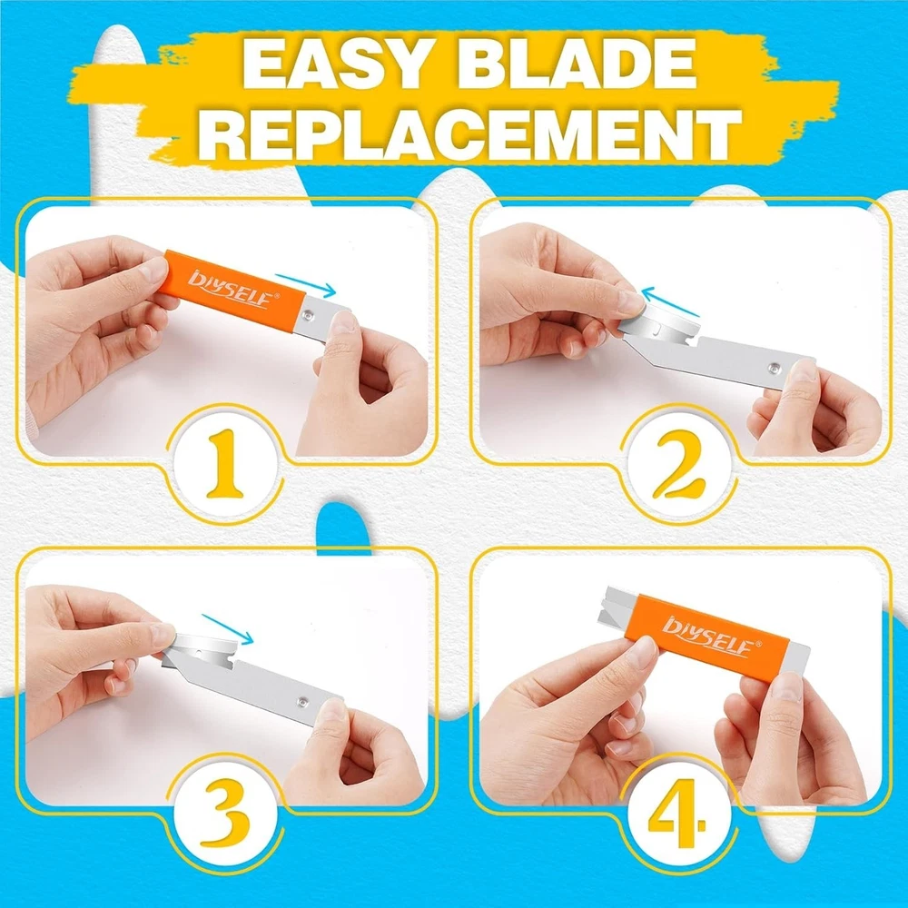 About this item VERSATILE SET OF 12 RAZOR BLADE KNIVES: Unleash the power of simplicity with our set of 12 razor blade knives, featuring an array of vibrant colors (red, yellow, pink, blue, black, orange). Each retractable knife is a compact powerhouse, combining functionality with a touch of style for various cutting tasks. ALUMINUM SHEATH FOR DURABILITY: The sheath of our box knife is crafted from durable aluminum, ensuring longevity and robust protection. This lightweight yet sturdy material adds a layer of resilience to your utility knives, making them ideal for various scenes, for example, office, school and warehouse. HIGH CARBON STEEL SINGLE EDGE BLADES: Embrace the cutting precision of high carbon steel single-edge blades. Engineered for sharpness and endurance, these utility knife blades effortlessly handle a variety of materials. Whether it's slicing through cardboard, plastic, vinyl, paper or tackling intricate projects, expect consistent performance with every cut. EFFORTLESS BLADE RETRACTION: Experience convenience at your fingertips with our easy-to-use box cutters. The blades retract seamlessly with a simple tap, providing a hassle-free and intuitive operation. This user-friendly design enhances efficiency and ensures a smooth cutting experience, making these cute box cutters the go-to choice for both beginners and seasoned users alike. TRANSFORMABLE INTO SCRAPERS: Elevate your cutting experience by seamlessly transforming these razor knives into razor scrapers. The blade's position is easily changeable, allowing you to adapt the tool to different tasks. From precision cutting to efficient scraping, this set is a versatile companion for your toolbox.