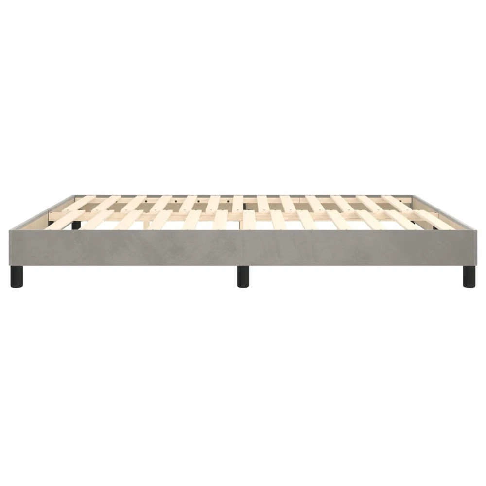 Size: California king Get a better restful night's sleep from this box spring bed frame! It makes a welcoming addition to any bedroom. Soft velvet: Velvet is a soft, luxurious fabric that is recognized by its dense pile of evenly cut fibers that have a smooth nap. Velvet fabric features a distinctive soft feel, making it comfortable to touch. Supportive legs: The bed is supported by sturdy legs, which ensure its stability, safety and firmness. Plywood slats: The plywood slats provide good weight distribution, ensuring that the mattress stays in place with every twist and turn of your body during sleep. Good to know: A mattress is not included with this bed. We do offer a various selection of mattresses. You can check our shop for a matching mattress. Color: Light gray Material: Velvet (100% polyester), plywood, engineered wood Overall dimensions: 85" x 72" x 9.8" (L x W x H) Suitable mattress size: 72" x 83.9" (W x L) California King (mattress not included) California Proposition 65