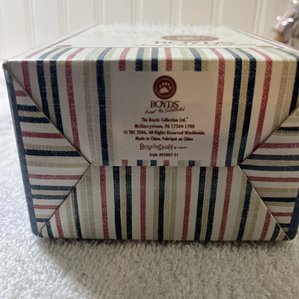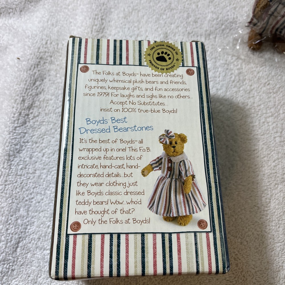 Animal:BearStatus:RetiredColor:BrownNumber of Items:1Time Period Manufactured:2000-2009Items Included:DressType:Resin BearUPC:Does not applyCollection:Friends of BoydsSize:6 inBrand:BoydsYear Manufactured:2007Item Height:6 ingtin13:Does not applyAnimal Species:BearAntique:NoCountry/Region of Manufacture:China