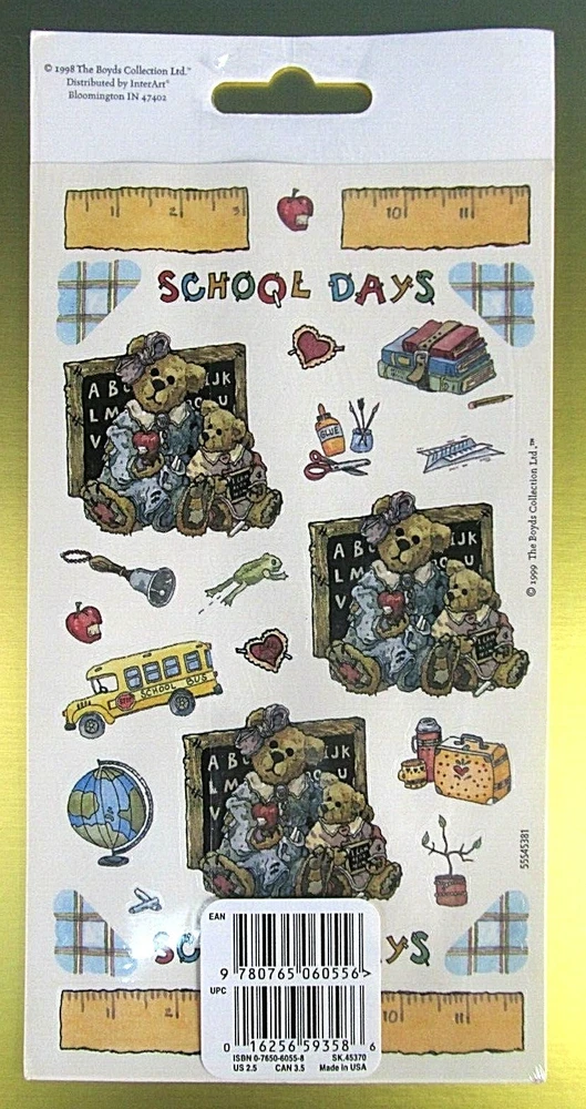 Sticker Pack Is Vintage New. Sticker Pack Comes With 2 Sheets. Sticker Theme Is Boyd's Bear School Days. When Purchasing Multiple Sticker Sheets Or Packs Please Add All Items To Cart Before Purchase So That Your Purchase Combines Down To Base Shipping Price. All items are shipped WITHOUT tracking in an envelope with cardstock.