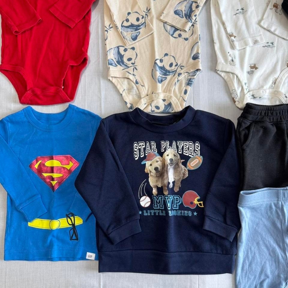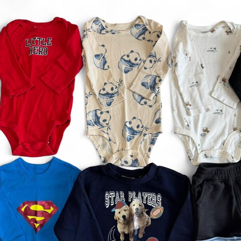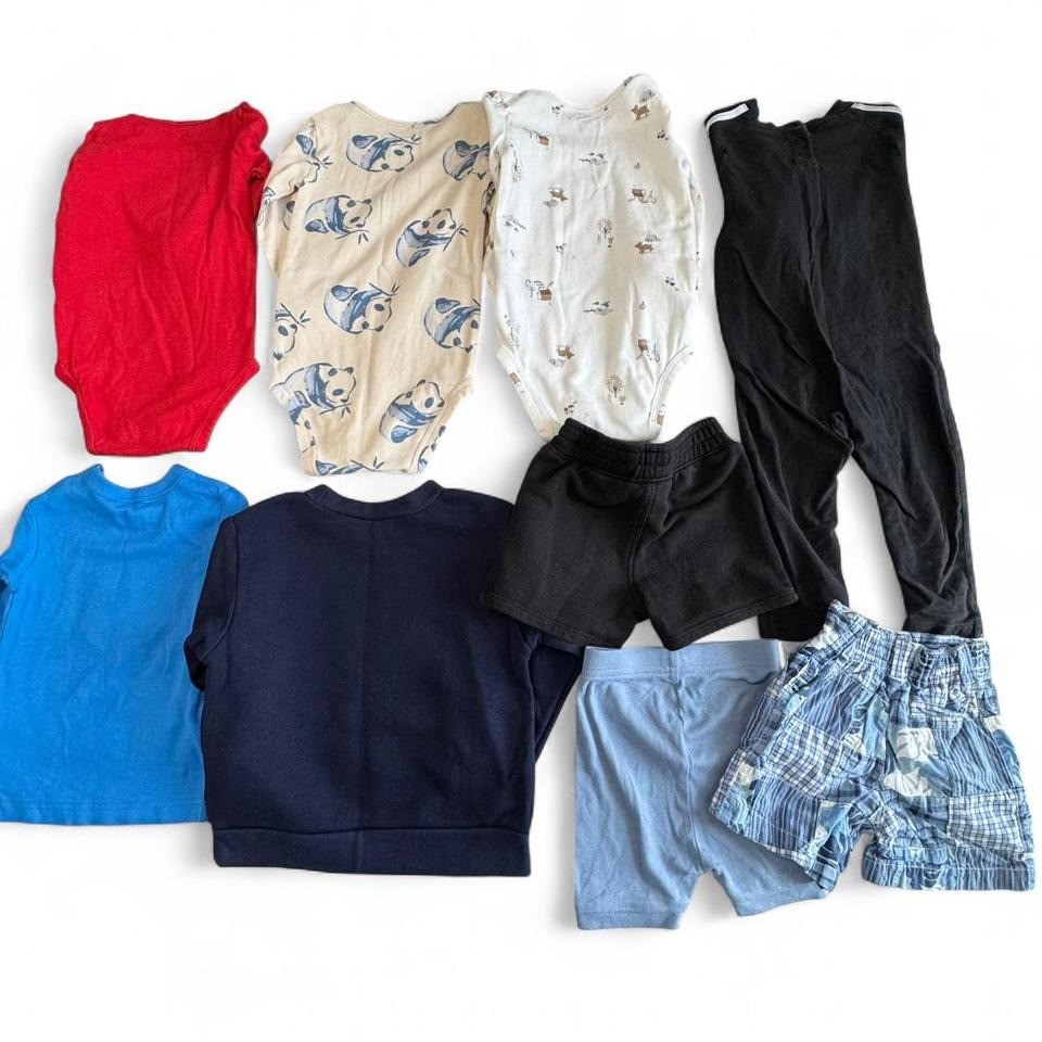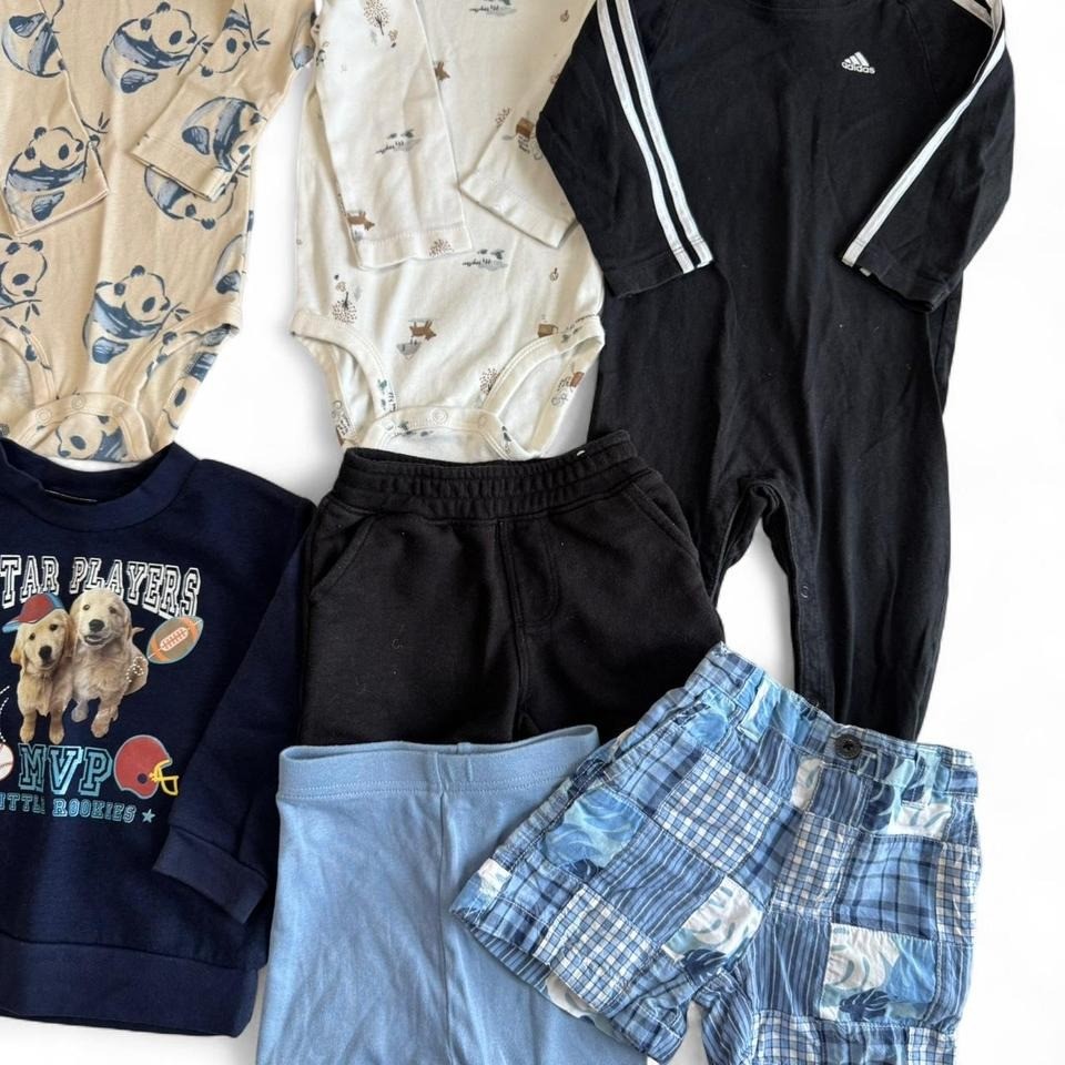 9-piece boys clothing bundle in size 18 months. Includes: 3 Long Sleeve One-Piece Bodysuits Adidas Long Sleeve Top + Pants One piece 1 Long Sleeve Sleep Shirt (NWOT) 1 Blue Long Sleeve Pullover 1 Pair Blue Patterned Shorts 1 Pair Blue Pajama Shorts (NWOT) 1 Pair Black Daytime Shorts Brands: Carters, Old Navy, Adidas & more Condition: Mix of NWOT and gently loved Size: 18 Months Perfect for year-round wear—great value bundle! Keywords: boys 18m clothing lot, Adidas baby outfit, Carters bodysuits, baby boy bundle, toddler clothes set Hashtags: #BabyBoyClothes #CartersBaby #OldNavyKids #ToddlerStyle #ClothingBundle