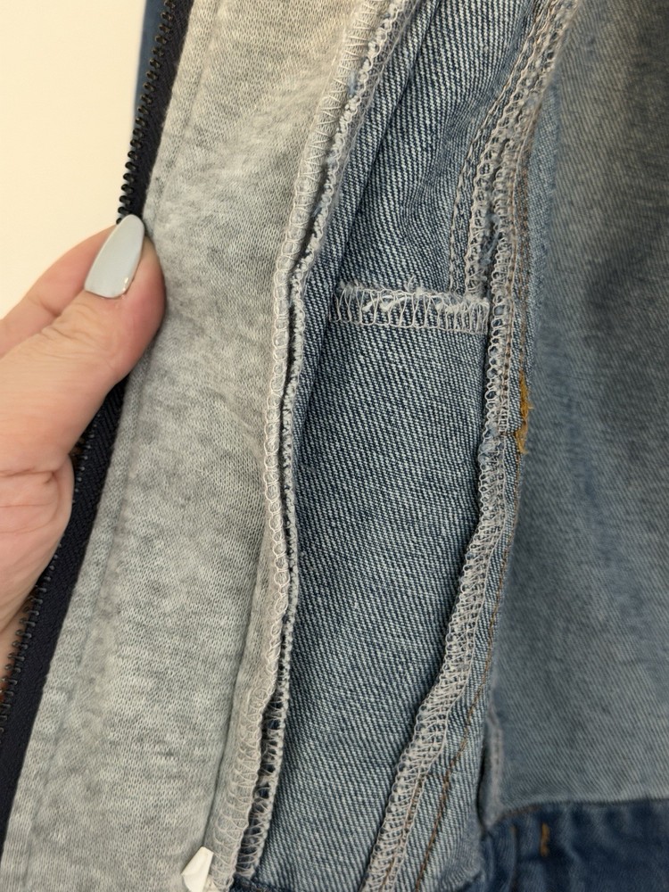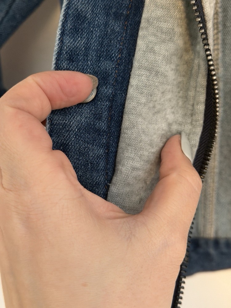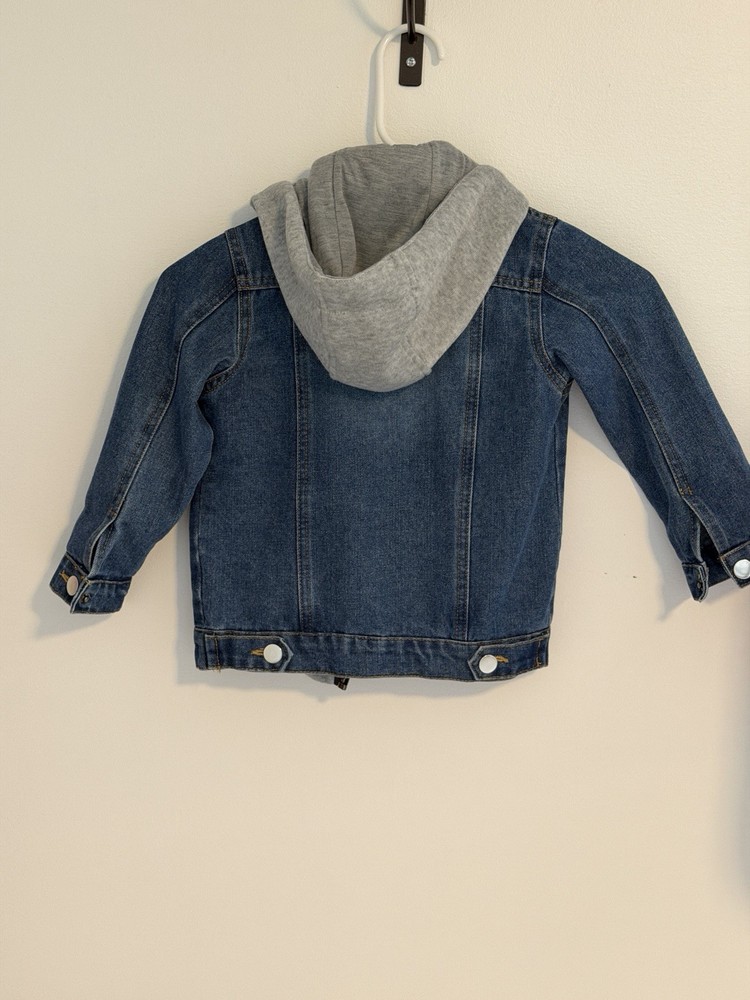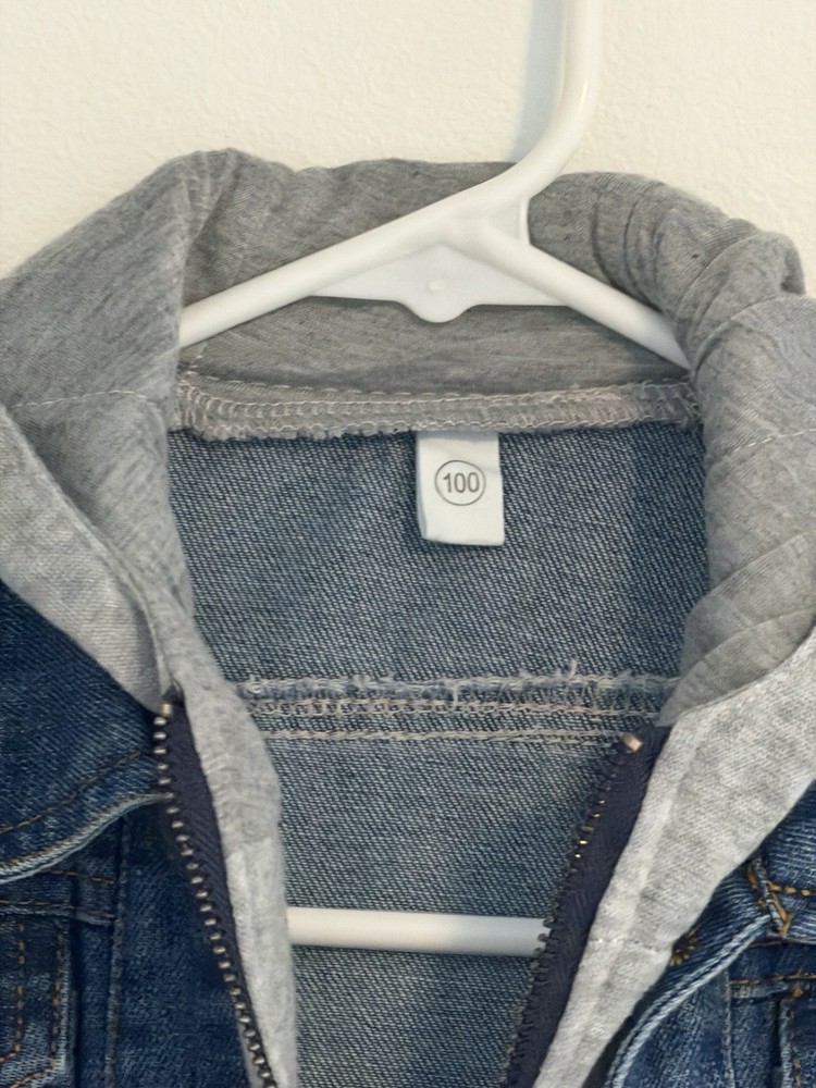 This jacket was worn only a few times and is in great condition. No specific brand. Size tag is 100, which fits like a US 3T or 4T. It features a unique 2-in-1 layered design with an attached gray jersey hood and a built-in shirt hem at the bottom to give it a trendy layered look. It has a front zipper and button closure with functional chest pockets. If you have any questions, please ask. Smoke and pets free clean house. All items are kept in a dedicated clean closet.
