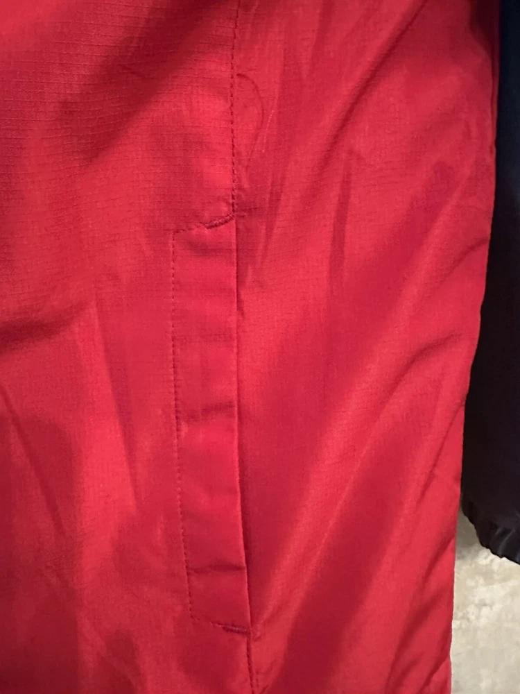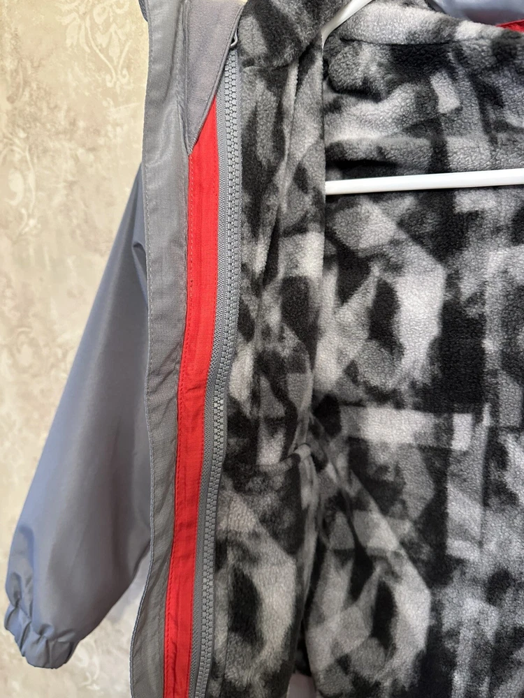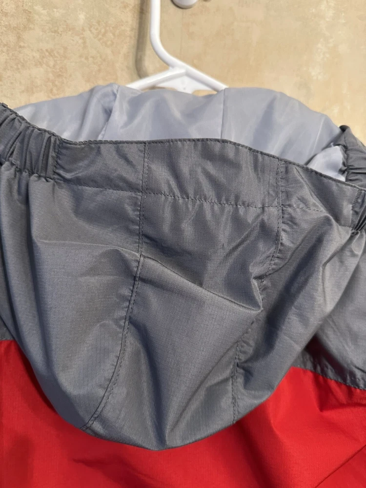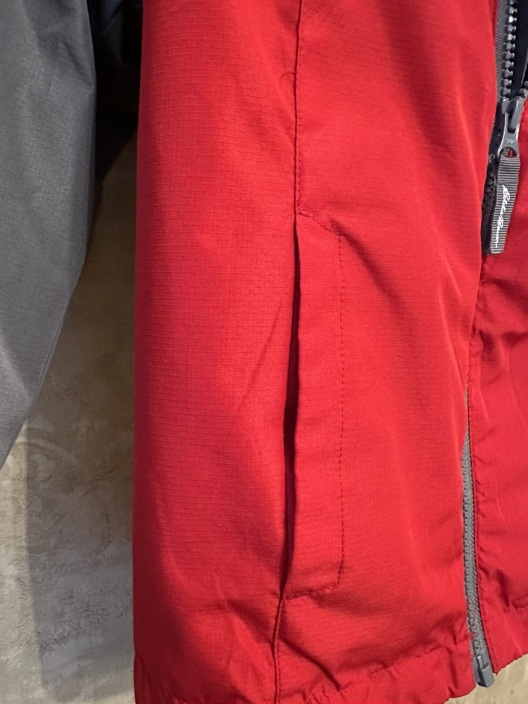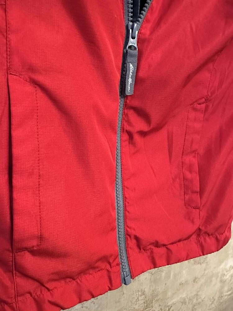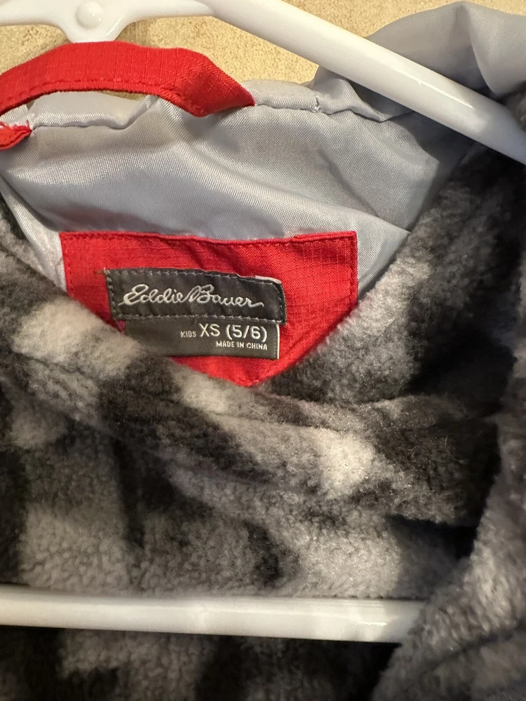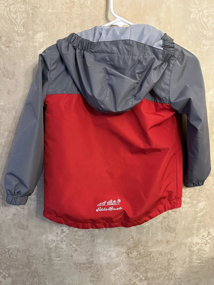This is a Boys Eddie Bauer Jacket in size 5/6, designed with a zip closure for easy wear. The outer shell material is 100% nylon, providing durability and protection from the elements. This gray and red jacket features a basic style perfect for everyday wear, and it includes a zip liner for added warmth and versatility. Perfect for young boys who enjoy outdoor activities or simply need a reliable jacket for cooler weather. 299