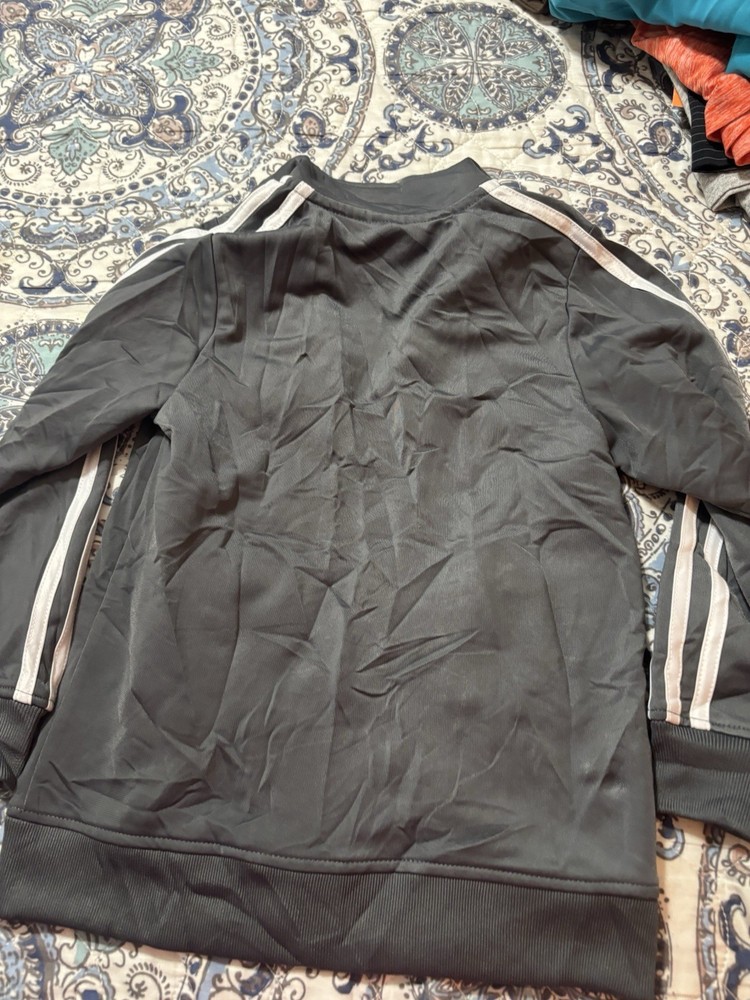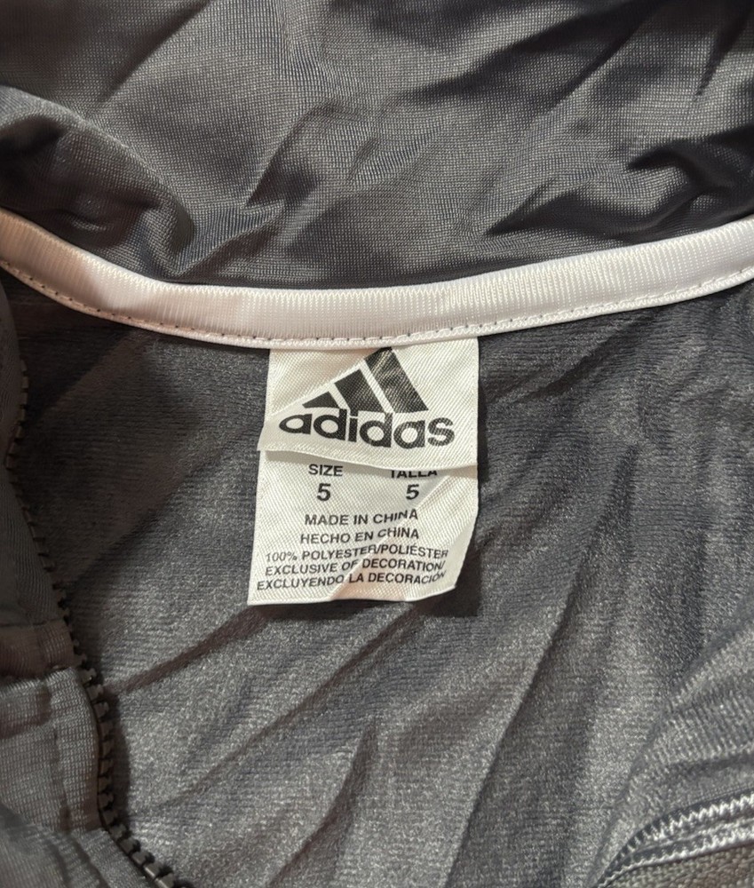 This Boys Gray Zip Up ADDIDAS Track Jacket with Double White Stripes in size Medium 5 is a stylish and practical addition to any young boy's wardrobe. Made from durable polyester with a soft lining, this jacket features long sleeves, a full zip closure, and convenient pockets for storing small items. The gray color with white stripes adds a sporty and trendy touch, perfect for travel, activewear, or casual occasions. With the iconic Adidas brand logo and a regular fit, this track jacket is a versatile and comfortable choice for boys who love athleisure and sports styles.