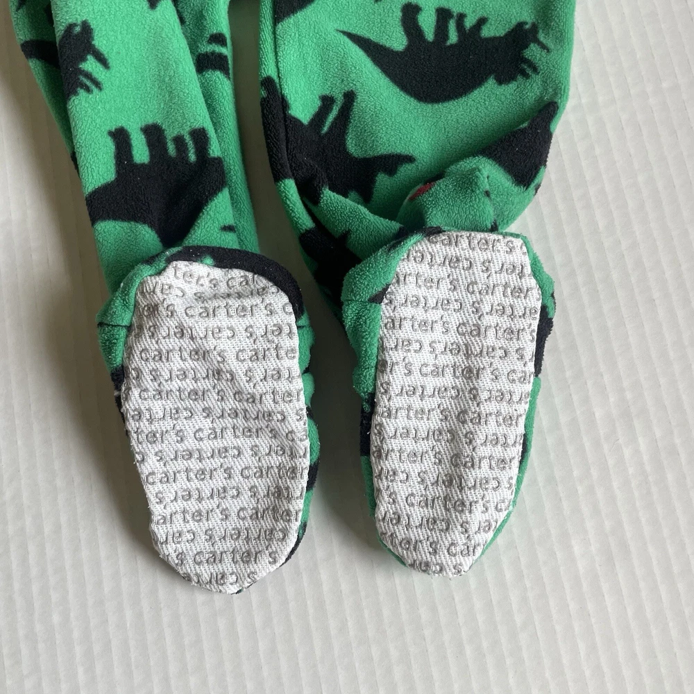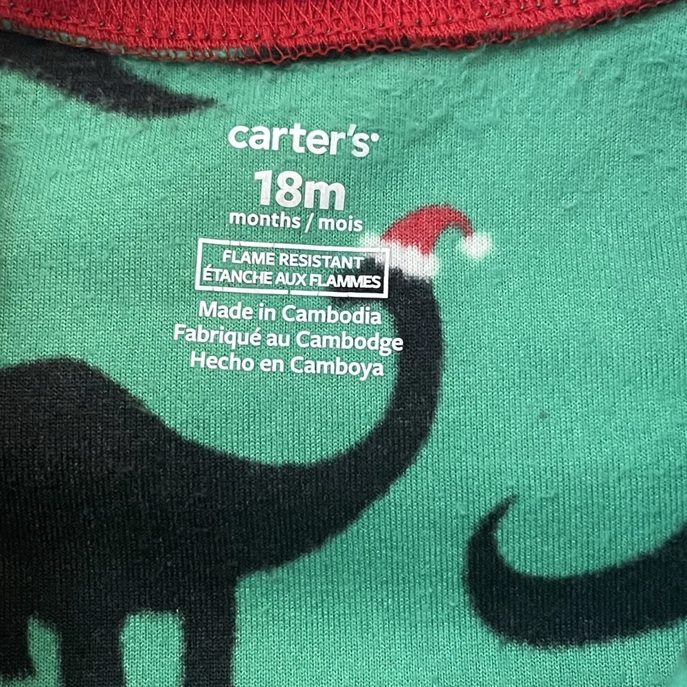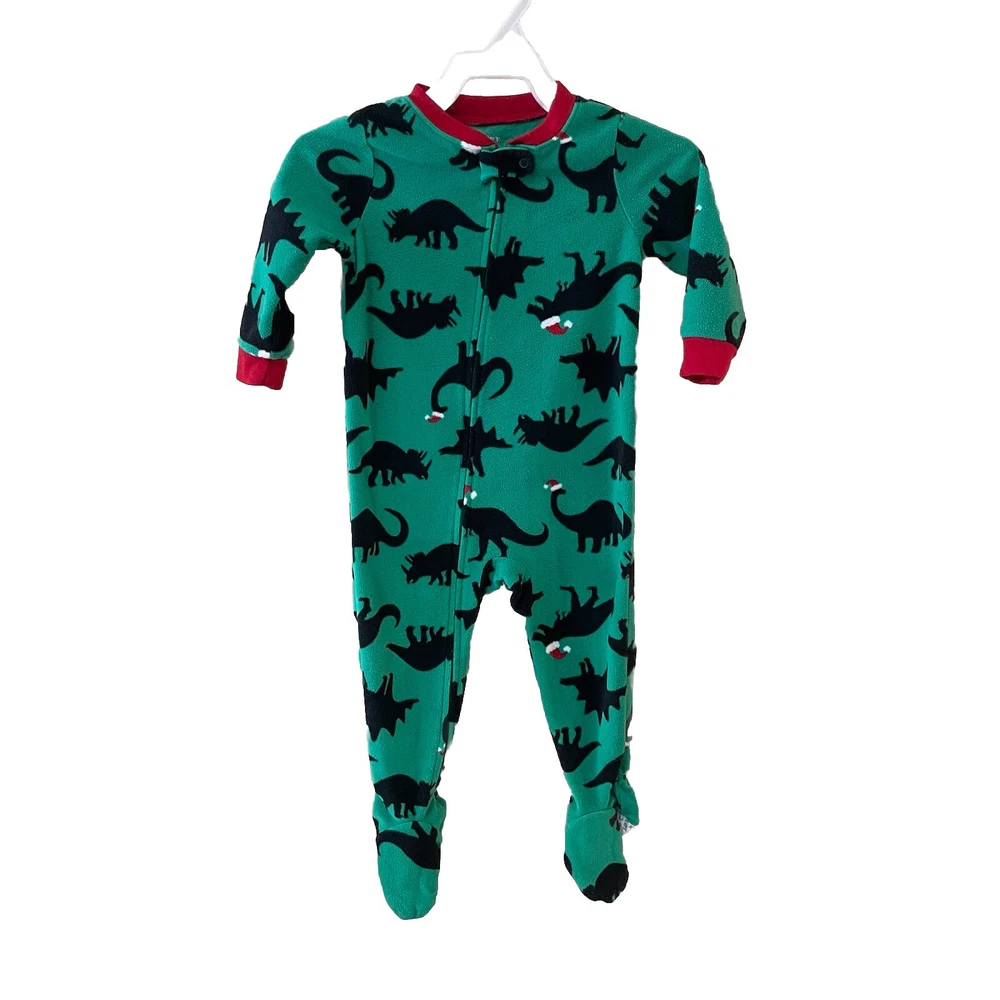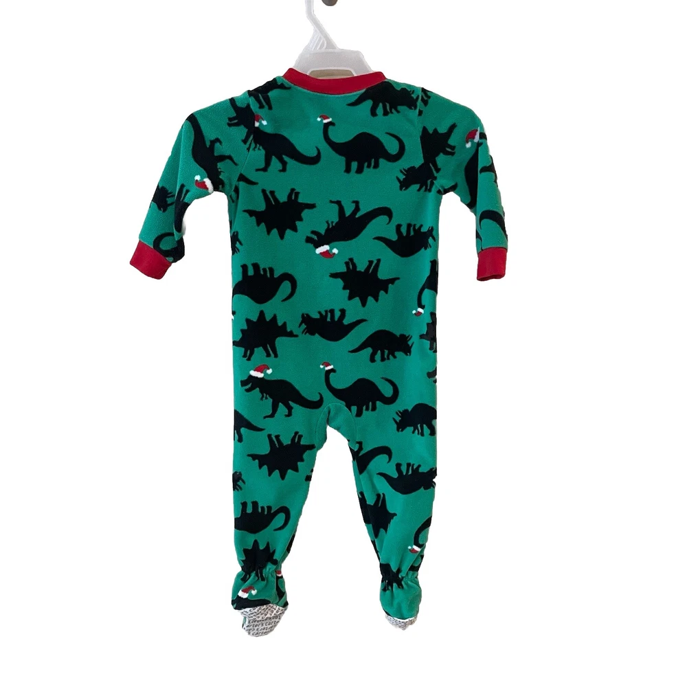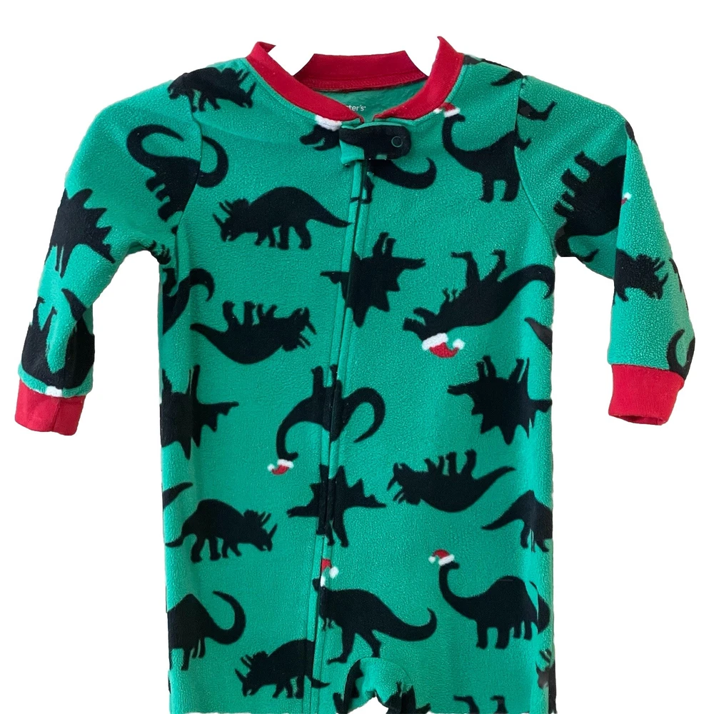 This adorable one-piece bodysuit from Carter's is perfect for your little boy who loves dinosaurs and Christmas. The green fleece material with dinosaurs wearing red Santa hat and full zipper closure makes it easy to wear and take off. The long sleeves and footed design keep your little warm during the colder seasons of fall, winter, and spring. The 100% polyester material is machine washable for easy care and maintenance. This one-piece bodysuit is ideal for boys aged 18 months and is a great addition to their wardrobe. Get your hands on this cute and comfortable bodysuit today! Pre-owned.