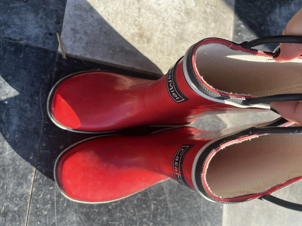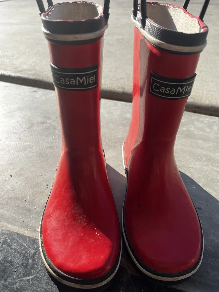 Boys' Casa Miel rain boots in size 3. These red rubber boots feature a waterproof design, ideal for winter. With a casual style, these boots are suitable for various occasions. The outsole material is rubber, providing durability. Imported from China, these boots are not handmade and are not personalized. The brand is Casa Miel, specializing in kids' footwear. Ideal for keeping little feet dry and stylish in wet weather.