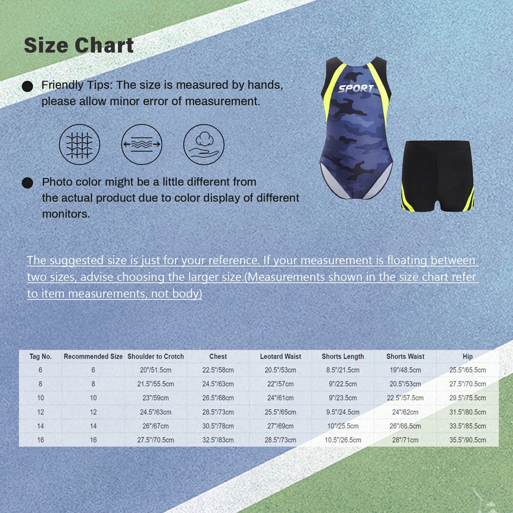 Click Here to New Arrivals New Arrivals Hot Sale Women's Dresses Women's Swimsuit Girls'Dresses Girls'Sleepwear Girls'Swimwear Boys'Clothing Baby Clothing Boys Suit Training Set Color Block Outfits Workout Leotard With Shorts 2 Piece #1 Set Include : 1x Leotard, 1x Shorts Condition : New without tag Material : 85% Polyester, 15% Spandex Features : The leotard is available in camouflage and striped print. Color block patchwork design makes your child look stylish and energetic. Sleeveless leotard for boys, the press buttons at the crotch allow your child to easily put on and take off the outfit. The matching shorts ensure flexibility and ease of movement when leaping or tumbling. Elastic waistband for a better fit. Made of premium fabric, breathable and soft, moisture-wicking and skin-friendly, keeping your child comfortable all day long. Suitable for rhythmic gymnastics, acrobatics, practice, competition, stage performance, yoga, sports, workout, and etc. Size Chart : The suggested size is just for your reference. If your measurement is floating between two sizes, advise choosing the larger size. (Measurements shown in the size chart refer to item measurements, not body) Tag No. Recommended Size Shoulder to Crotch Chest Leotard Waist Shorts Length Shorts Waist Hip 6 6 20"/51.5cm 22.5"/58cm 20.5"/53cm 8.5"/21.5cm 19"/48.5cm 25.5"/65.5cm 8 8 21.5"/55.5cm 24.5"/63cm 22"/57cm 9"/22.5cm 20.5"/53cm 27.5"/70.5cm 10 10 23"/59cm 26.5"/68cm 24"/61cm 9"/23.5cm 22.5"/57.5cm 29.5"/75.5cm 12 12 24.5"/63cm 28.5"/73cm 25.5"/65cm 9.5"/24.5cm 24"/62cm 31.5"/80.5cm 14 14 26"/67cm 30.5"/78cm 27"/69cm 10"/25.5cm 26"/66.5cm 33.5"/85.5cm 16 16 27.5"/70.5cm 32.5"/83cm 28.5"/73cm 10.5"/26.5cm 28"/71cm 35.5"/90.5cm Friendly Tips: The size is measured by hands, please allow 1-3cm errors of measurement. Photo color might be a little different from the actual product due to color display of different monitors. #2 Set Include : 1Pc Shorts Condition : New without tag Material : 90% Polyester, 10% Spandex Features : Girl’s dance booty shorts, slim cut. Stretchy and breathable fabric with elastic waistband, band on leg to prevent gapping. Can wick sweat away to keep your children cozy and comfortable. Suitable for jazz, hip hop dance practice, yoga, workout, exercise, etc. Please check the size clearly before purchasing, hand wash. Size Chart : The suggested size is just for your reference. If your measurement is floating between two sizes, advise choosing the larger size. (Measurements shown in the size chart refer to item measurements, not body) Tag No. Recommended Size Waist Hip Length 4 4 19.5-25.5"/49.5-65.5cm 21"/53.5cm 6.5"/16cm 6 6 21-27.5"/54-70cm 22.5"/58cm 7"/18.5cm 8 8 23-29"/58.5-74.5cm 24.5"/62.5cm 8"/20.5cm 10 10 24.5-31"/63-79cm 26"/67cm 8.5"/22.5cm 12 12 26.5-32.5"/67.5-83.5cm 28"/71.5cm 9.5"/24.5cm 14 14 28-34.5"/72-88cm 29.5"/76cm 10.5"/26.5cm 16 16 30-36"/76.5-92.5cm 31.5"/80.5cm 11"/29cm Friendly Tips: The size is measured by hands, please allow 1-3cm errors of measurement. Photo color might be a little different from the actual product due to color display of different monitors. Product names are trademarks of the listed manufacturer or other owners, and are not trademarks of aperoldson. The manufacturer does not necessarily endorse use of these products. Payment Methods Terms and Conditions Shipping Combined shipping is limited only to the items listed under this seller account : oreatest All the free shipping item don't offer discount. We REDUCE US$1.00 on shipping cost for each additional item. Please contact us to send you the update invoice once you finish your purchase. Please note that only the item in same currency can be combined.Please note that we do NOT offer shipping discount for bidding orders or item value less than $5.00 International Orders: The buyer is responsible for any applicable import duties and local taxes. Please verify with your customs before making your purchase. Please verify your address during checkout. We are not responsible for any wrong or undeliverable addresses. Your item will be sent to your ebay address. Please make sure your ebay address is correct. Any non- received items caused by invalid address are not in our full refund or replacement policy. All items will be shipped within 1 business day after full payment is received. It takes about 10-20 days to US UK AU DE; about 20-35 days to other countries.Shipping may influenced by holidays, events and other uncertainties. We could not guarantee the arrival time. If you can't accept the shipping time, please check the extra charge with us to ship your item via express. Please check my other products below: Girls Coat Carnival Jacket School Activities Outerwear Majorette Dress Up Show USD 14.99 Girls Outerwear Stage Performance Jacket Photography Coat Fringe Epaulet Fancy USD 14.99 Women Jacket Party Outerwear Blazer Coat Adult Top Open Front Streetwear Lapel USD 11.99 Women Leotard Rhinestone Jumpsuit Modern Bodysuit Gymnastics Costume Mock Neck USD 12.59 Women Jacket Adult Coat Cropped Outerwear Long Sleeve Clubwear Patent Leather USD 11.99 Kids Girls T-shirt Short Sleeve Crop Top Outdoor Shirts Embroidery Blouse Gym USD 10.99 Women Leotard Rhinestone Dancewear Sparkly Unitards Sheer Rhythmic Festival USD 10.99 Women Leotard Backless Dresses Stretchy Dancewear Lyrical Gymnastics Ballet USD 12.59 Man Briefs Leather Shorts Side Lace-up Underpants Cosplay Jockstrap Low Rise USD 9.99 Women Set 3 Pieces Lingerie Schoolgirl Costumes With Thong Choker Dress Cute USD 10.99 Women Bra And Panties Bathers Vest With Briefs Two Piece Swimsuit Metallic Club USD 10.99 Women's Scarf Tribal Belt Skirts Performance Scarves Festival Pettiskirt Hip USD 11.99 Women Lingerie Low Rise Knickers V-String Panties Flirting Open Butt Temptation USD 10.99 Men Tank Rave Vest Fishnet Tops Dancing Patent Lace Sheer See Through Leather USD 12.99 Man Panties Disco Jockstrap Knickers Shorts Dance Briefs Patent Underpants Gay USD 9.99 Women Set