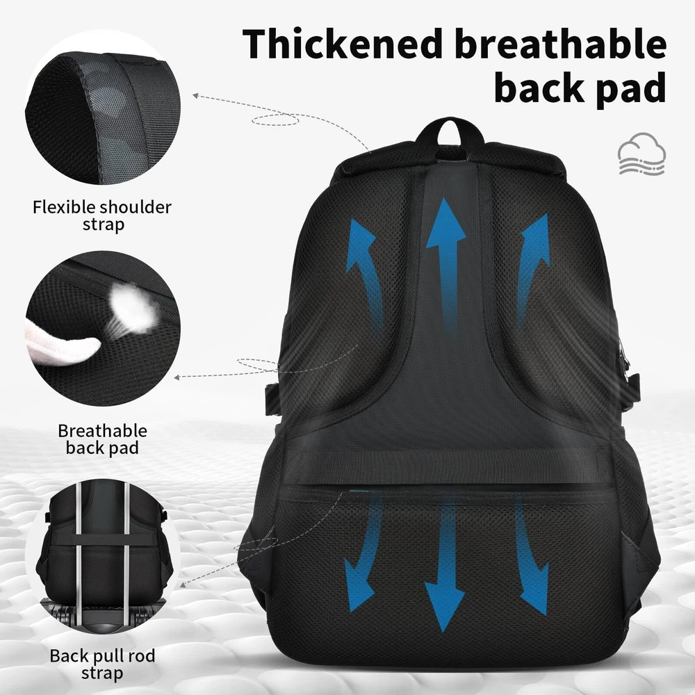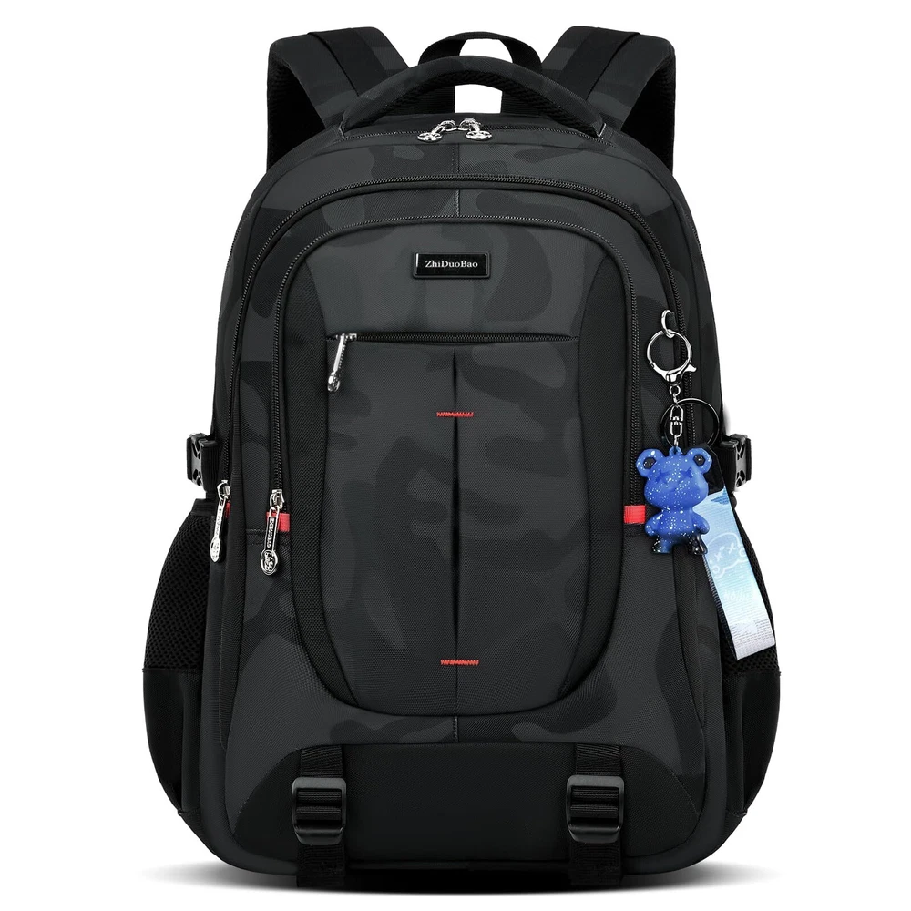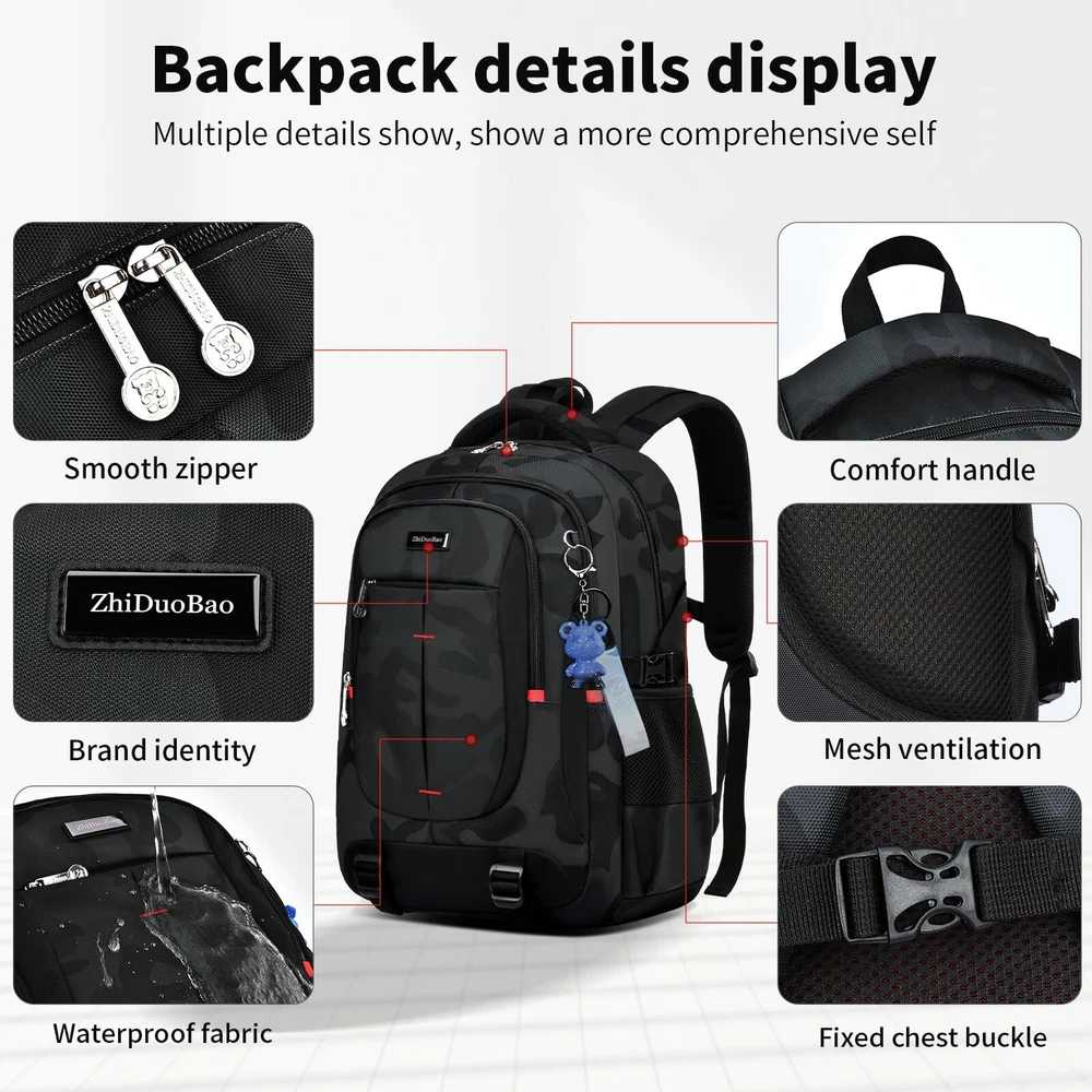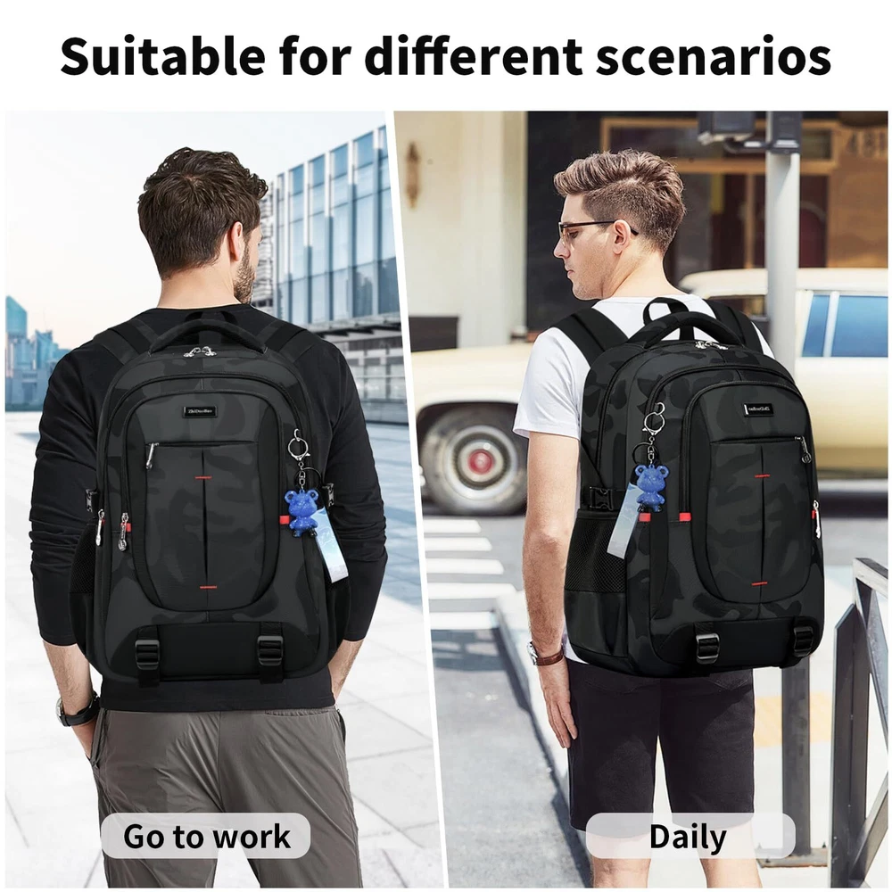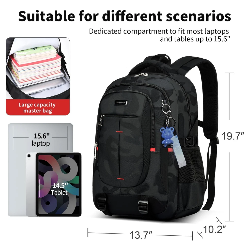 Versatile Design: Lightweight black camouflage backpack suitable for high school, junior high, and college students, as well as travel and everyday use. Spacious Interior: Accommodates laptops up to 17 inches, with multiple compartments for organizing books, notebooks, and other essentials. Comfortable Fit: Padded shoulder straps and back panel provide comfort and support during extended wear. Durable Construction: Made with high-quality materials to withstand daily use and wear. Unisex Style: Suitable for both men and women, with a sleek and modern design that appeals to all genders.